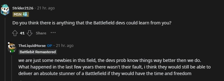當被問及《BattleBit Remastered》團隊能從DICE的開發者那裏學到什麼時,該開發者表示:“DICE的開發者可能比我們更加了解這些事情。”他還表示,他相信他們仍然能夠開發出令人震撼的《戰地》遊戲。