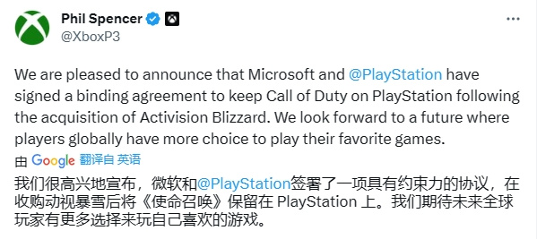 Xbox主管 菲爾·斯賓塞 在推特發文稱,Xbox已經和PlayStation正式簽署具有約束力的協議,《使命召喚》系列遊戲將在微軟收購動視暴雪後繼續登陸PlayStation平臺。包括約束時間在內的具體內容暫未公佈。