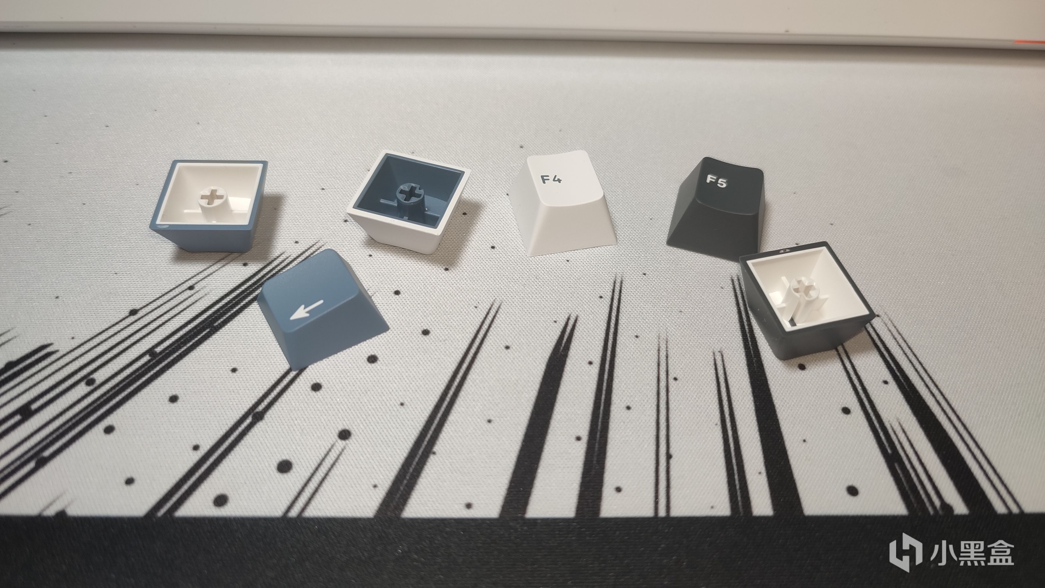 我这一把是“星际迷航”版本,套件颜色选择了更百搭的白色,键帽整体也以白、黑、深蓝三色作为主色。键帽整体采用双色注塑工艺,选择了更抗打油的PBT材质,高度则是很多人熟知也很早就在用的原厂(CHERRY)高度,整体触感非常顺滑,注塑水口也没问题。
