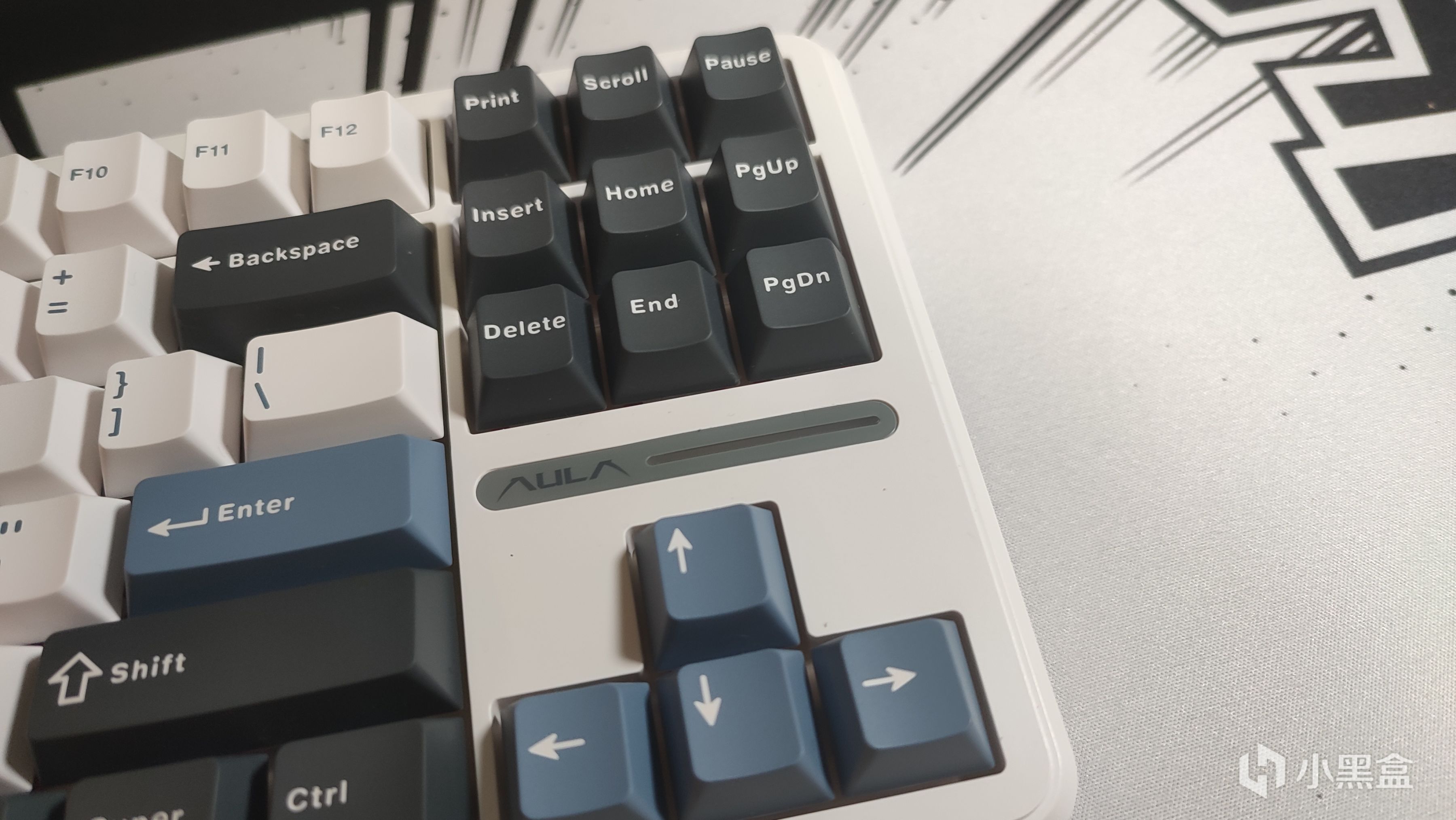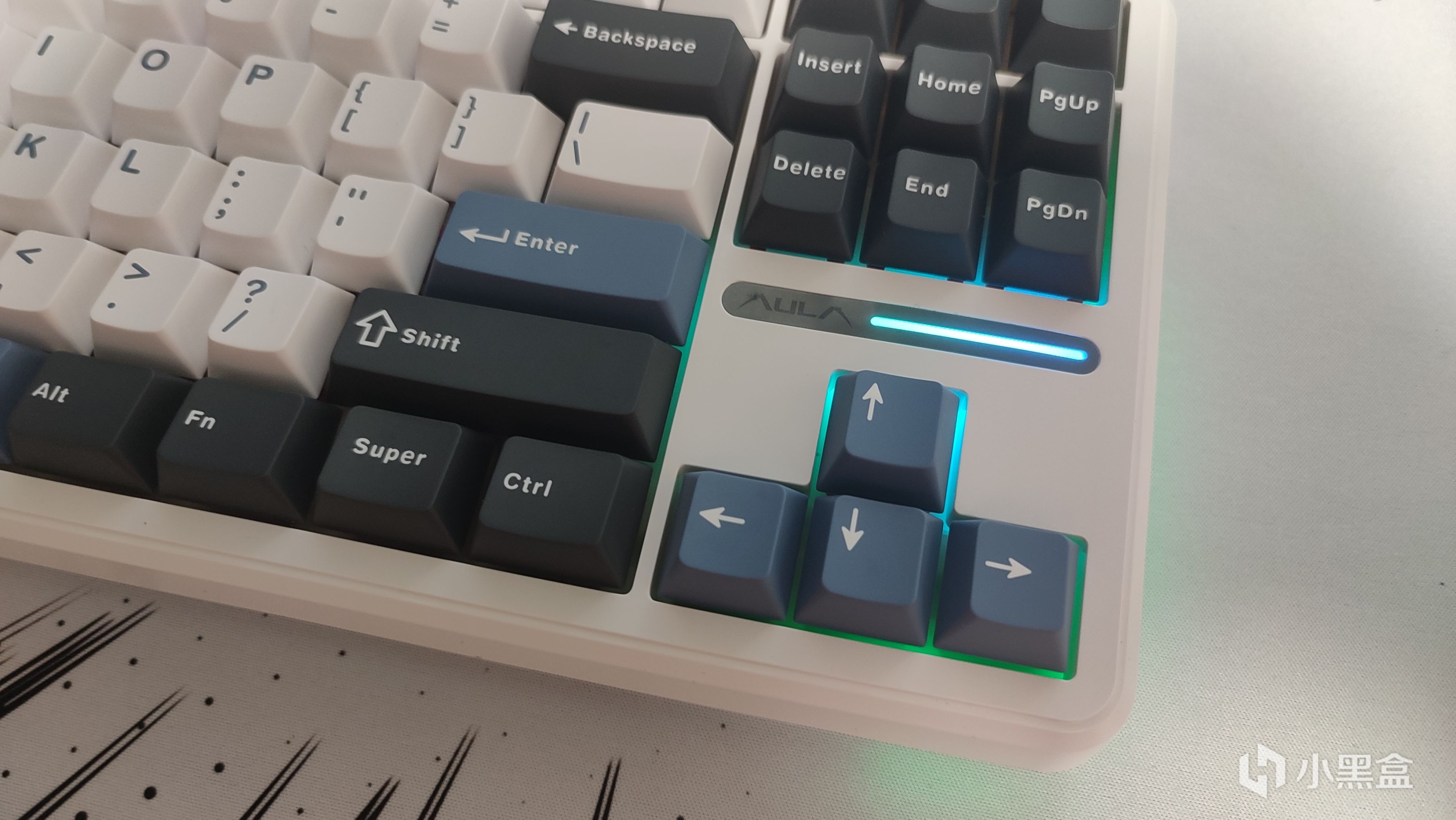 方向键上方是氛围灯的位置,旁边则是狼蛛的品牌名称,在这个位置刚好填补了87配列的空白,不过需要注意的是这里的颜色是为了搭配键帽配色,后续如果想更换其他配色的键帽可能会有些突兀。