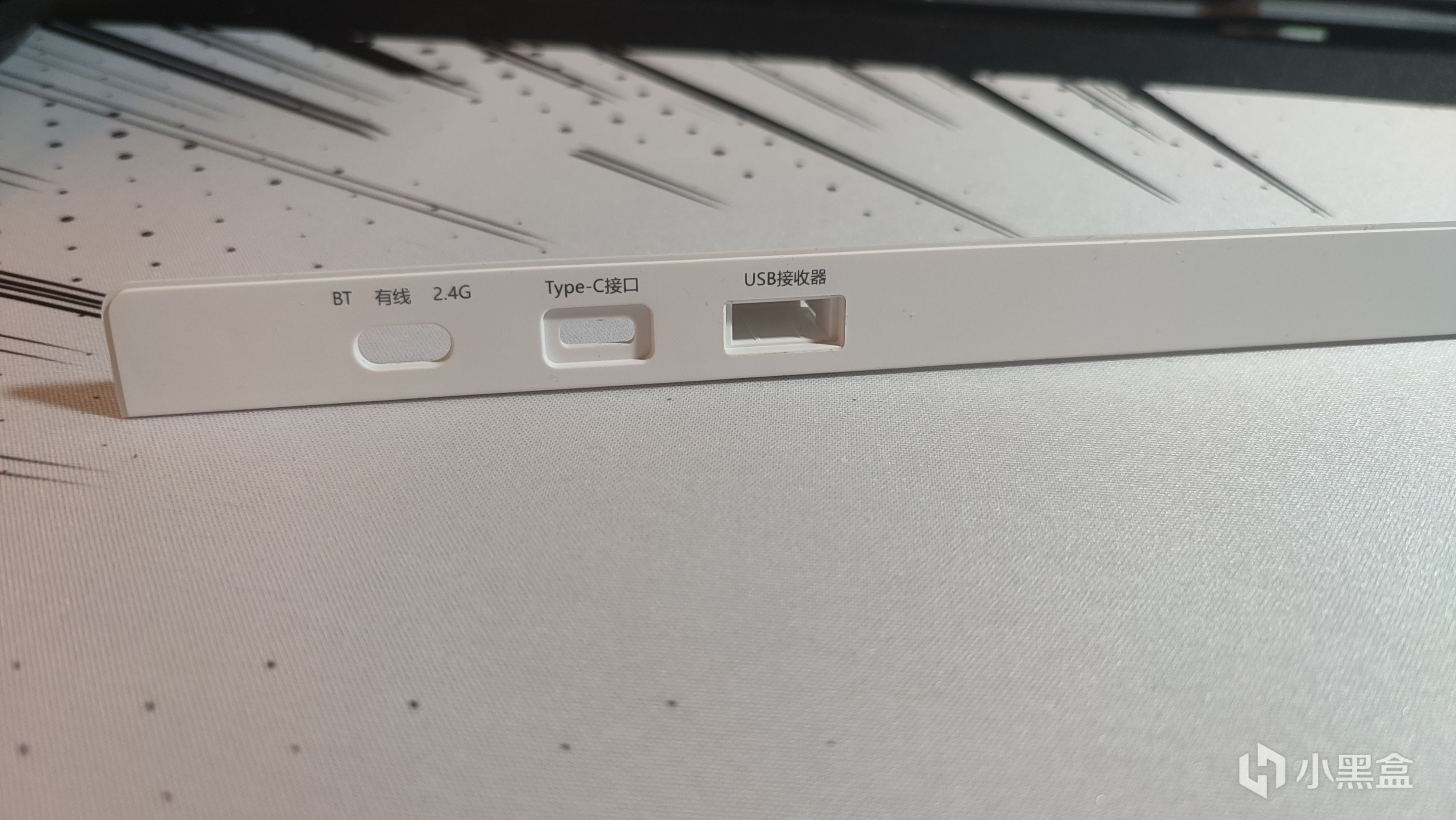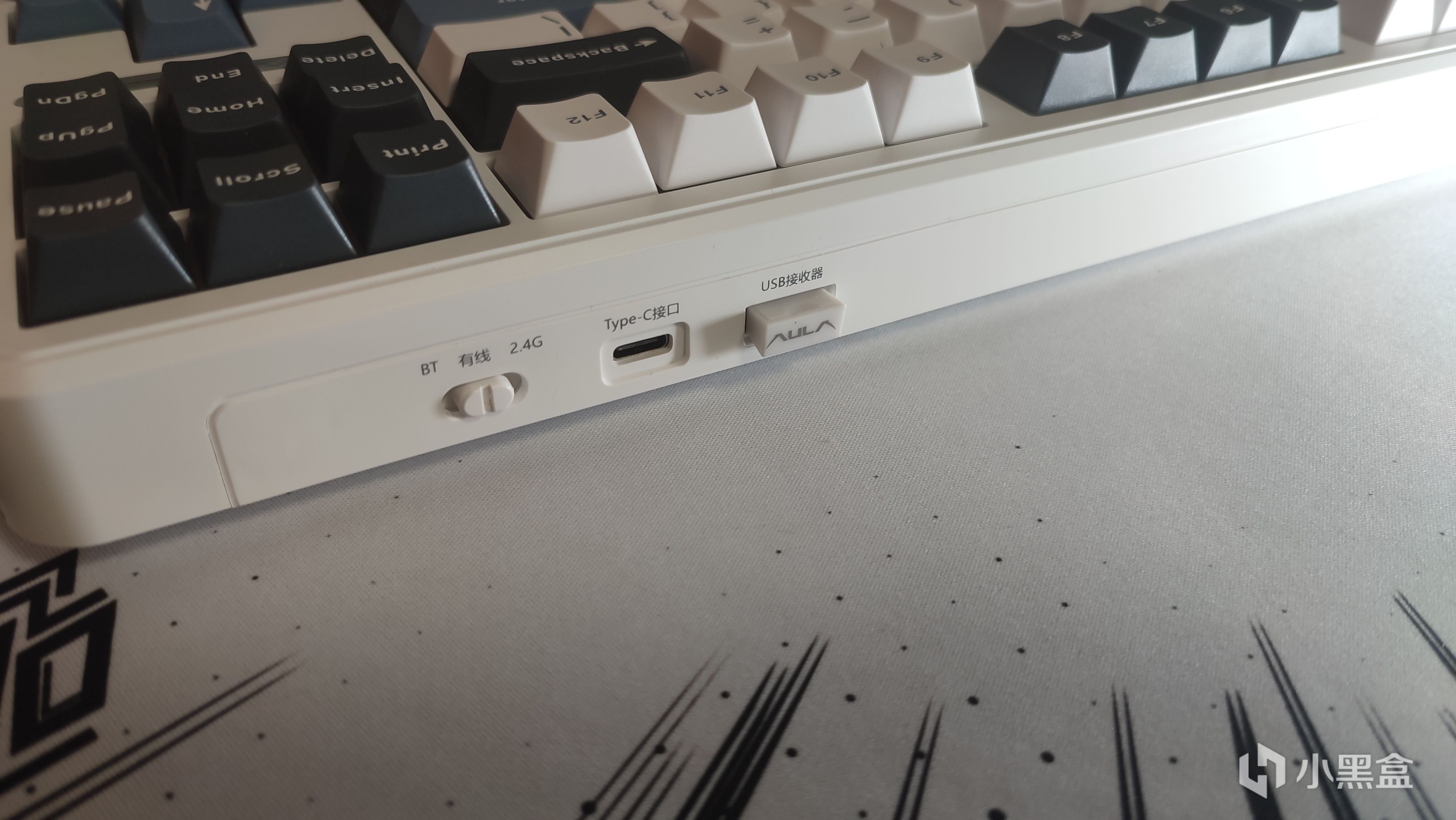 三模切换开关/数据线接口以及收纳仓则都是放到了键盘右上角的位置,每个的上面都标有提示。做在顶部位置减少了日常使用挪动键盘来收纳接收器以及切换三模开关,还是做的比较人性化的。
