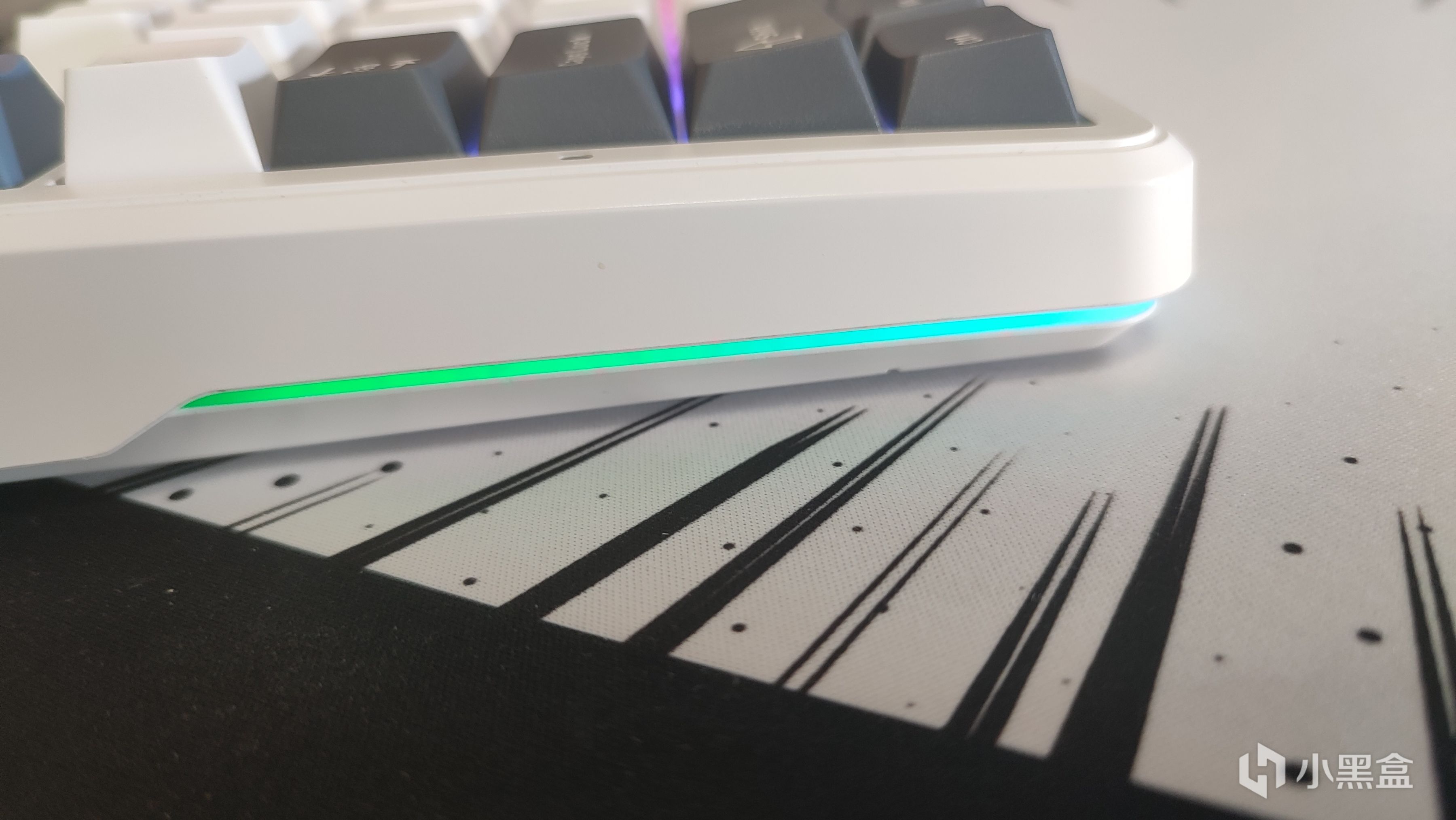 侧面加了两条灯带,不过不同于其他键盘,F87将这条灯带延申至正面,即使使用角度并不能看到侧面灯带,F87也可以通过延伸至正面的灯带让你感知到其存在,会让你觉得这钱没百花。