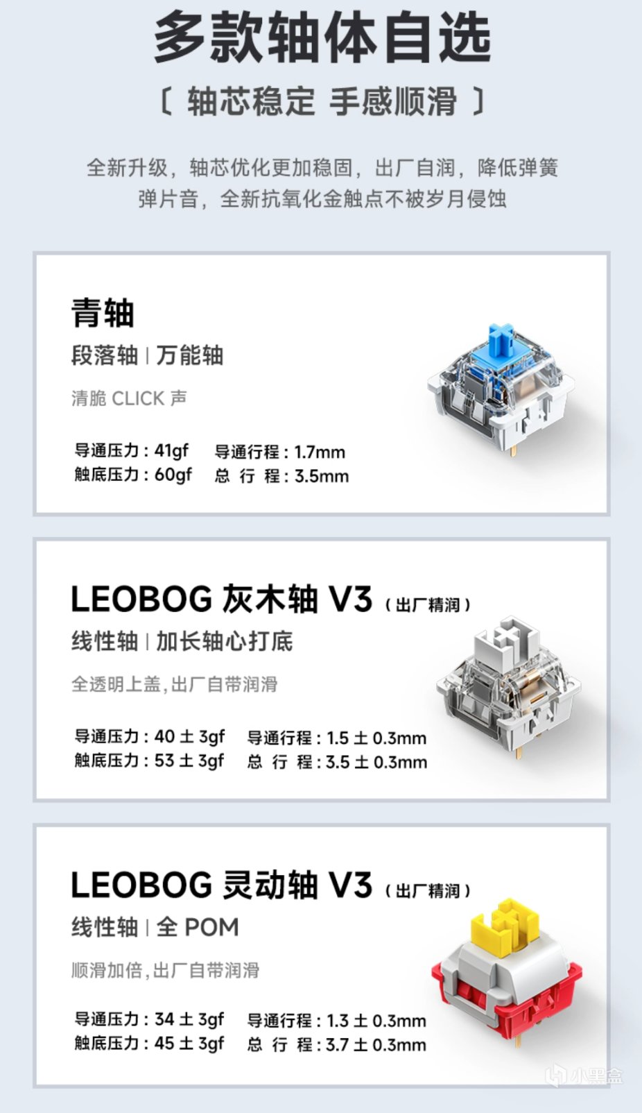 轴体同样有多个版本可以选,分别是最基础的“青轴”、低价轴中最出名的“灰木轴V3”、以及全POM材质的“灵动轴V3”,个人建议灰木或者灵动即可。关于灵动轴的测评可以参考灵动轴V3测评视频,这里就不多介绍了。