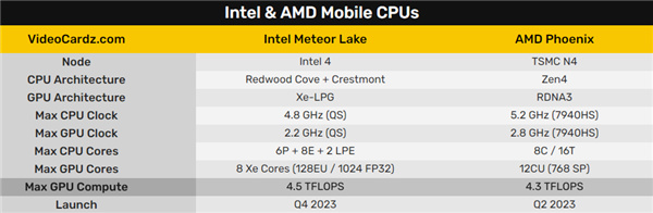 核顯方面率先引入Xe LPG架構,最多8個Xe核心,最高頻率可達2.2GHz,浮點性能甚至可以超越AMD目前最頂級的RDNA3架構的Radeon 780M。