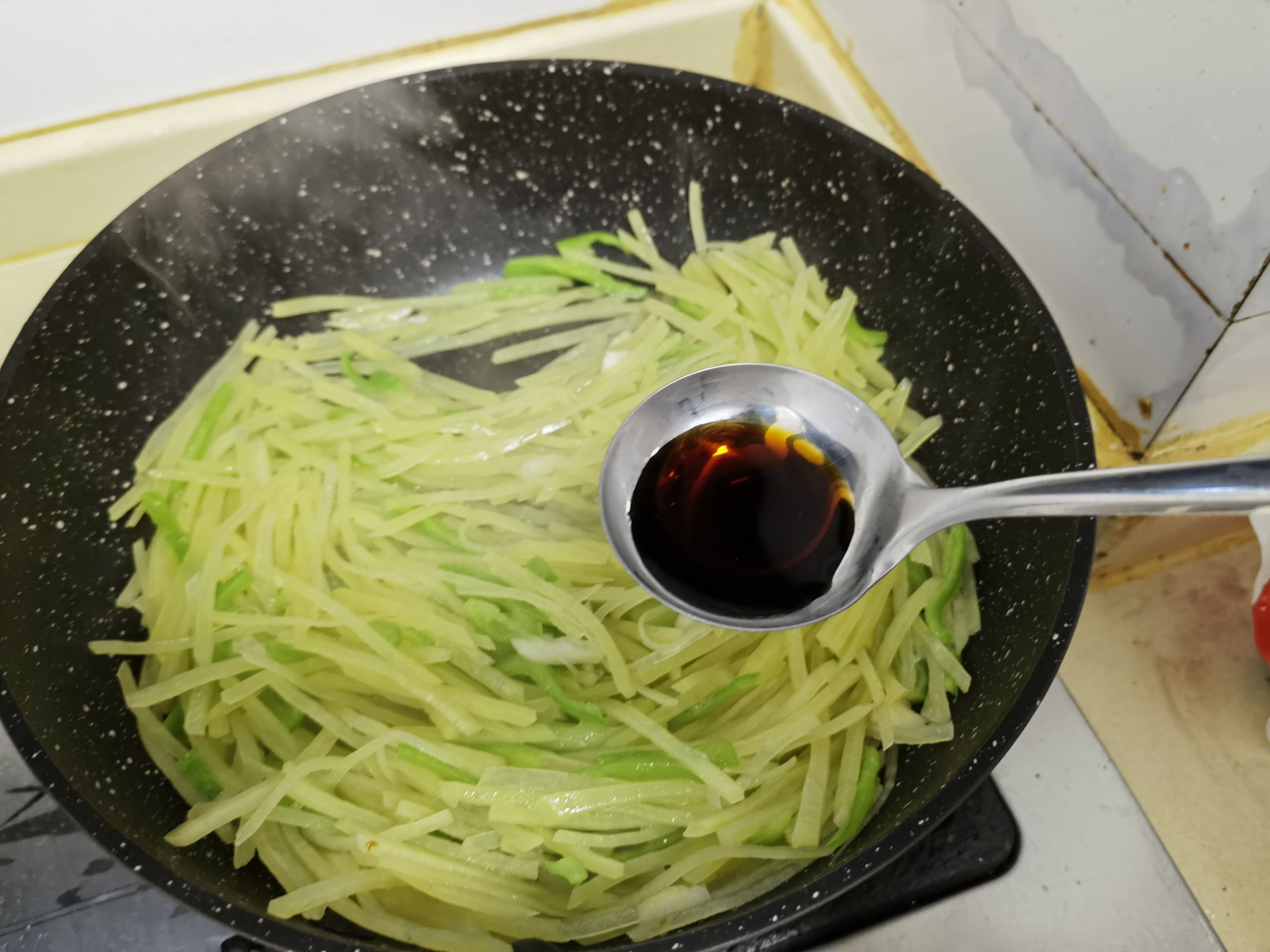 大約翻炒15 s後倒入半勺生抽、一勺陳醋,
