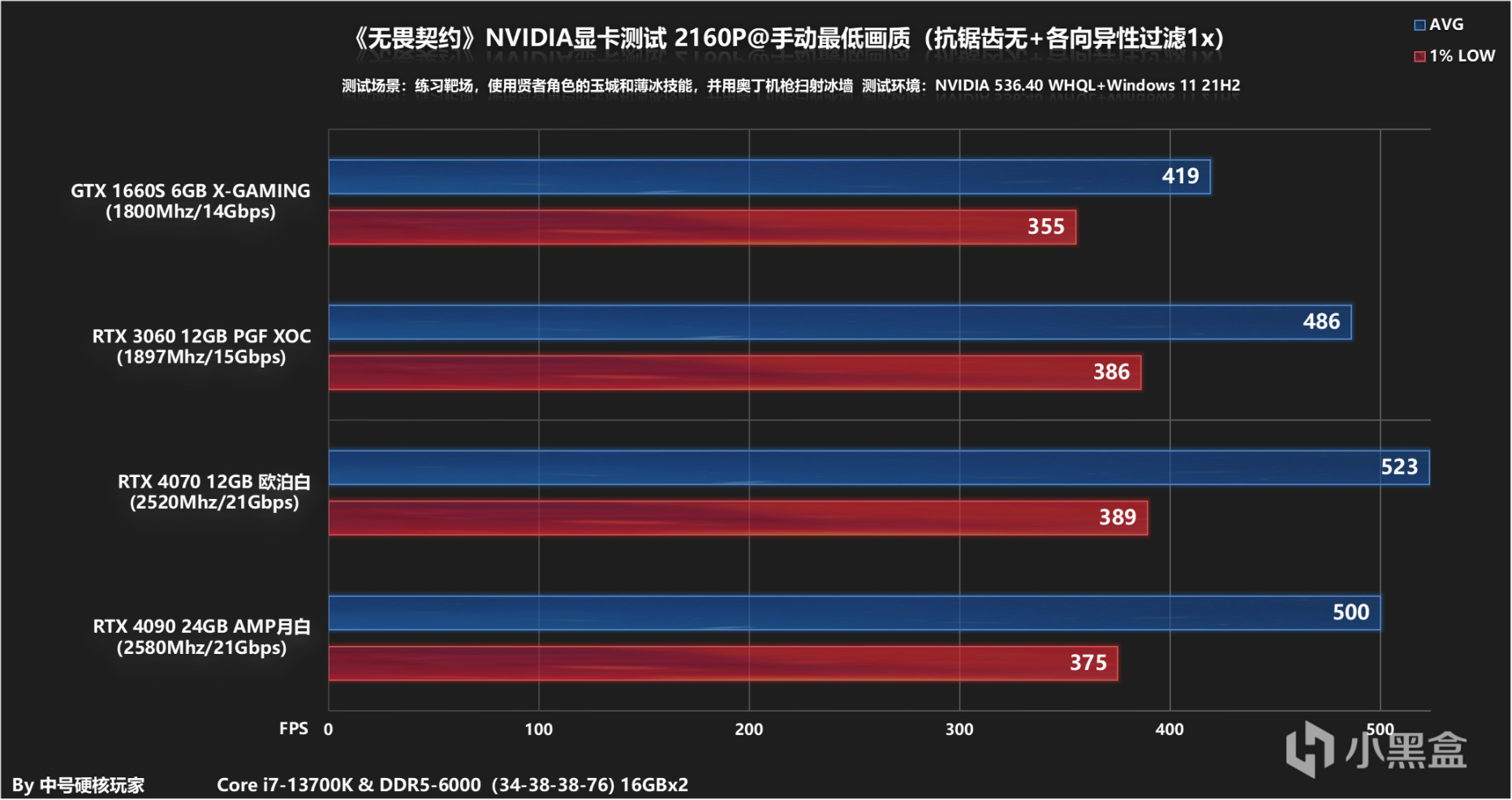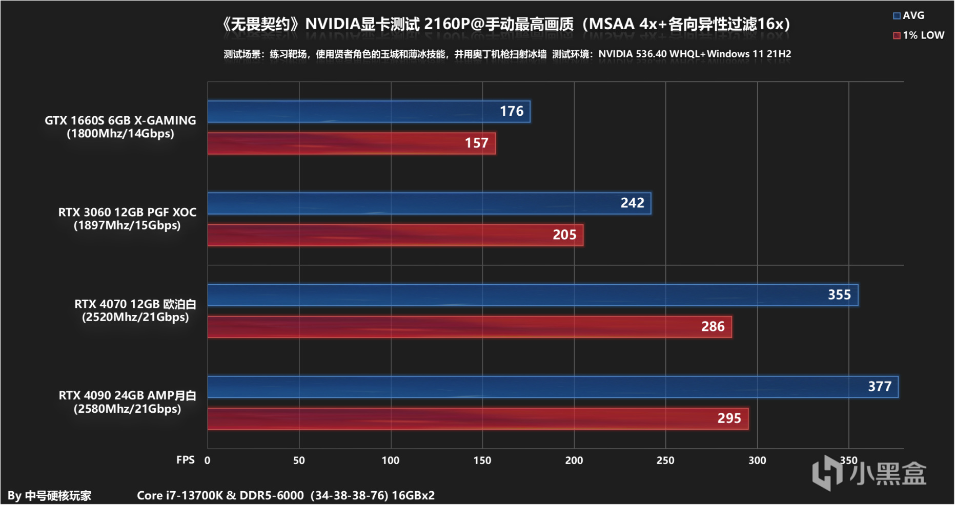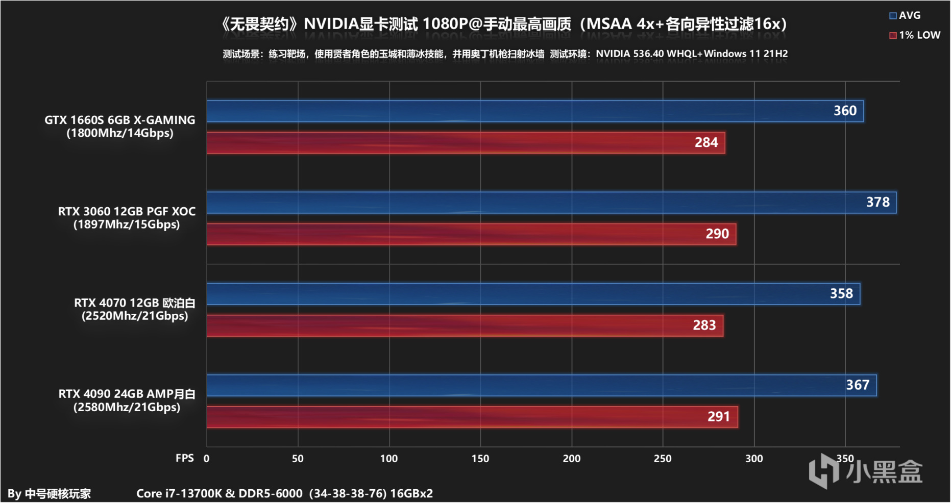 4K分辨率,最高畫質下終於可以把四款顯卡性能區分開來了,簡單來說GTX 1660S滿足4K@165HZ顯示器,而RTX 3060則是基本滿足4K@240HZ,剩下的RTX 4070/4090則是完美滿足。其實RTX 4090從頭到尾的測試對於這款遊戲都是性能過剩,除非要跑8K分辨率。《無畏契約》按照4K@240HZ的合格標準,只需要RTX 4060就能完美達標了。