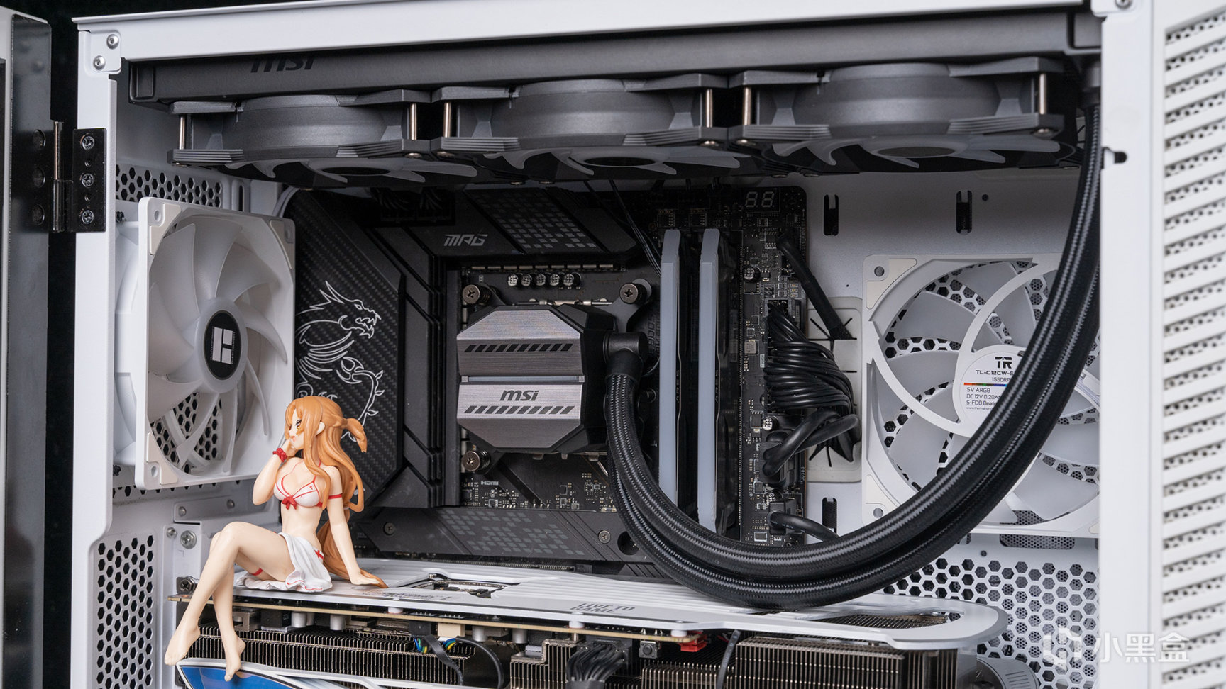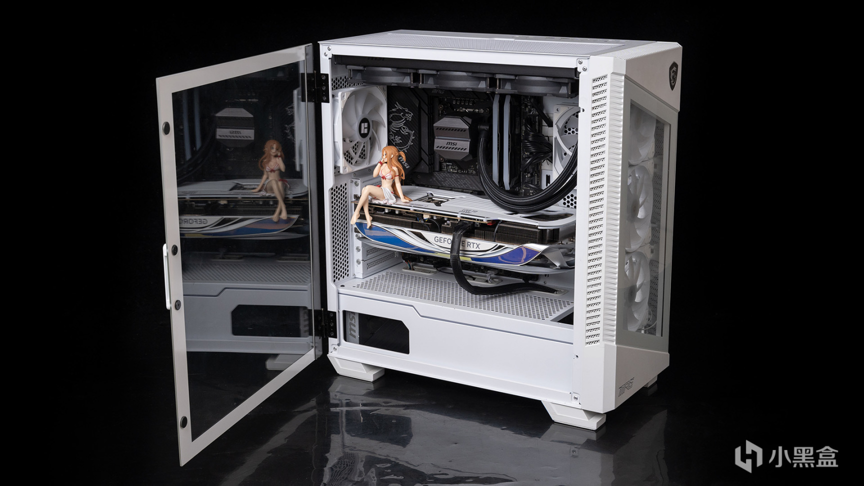 測試的機箱是微星MPG VELOX 刀鋒100R白色款,和RTX 4090 AMP月白搭配起來整體質感看起來不錯,機箱採用前、側半透海景房設計,前、側、後和頂部均支持安裝風扇,散熱體系很強大,除此之外機箱擁有前置USB-C、內置六路ARGB控制器和燈控按鍵等賣點。