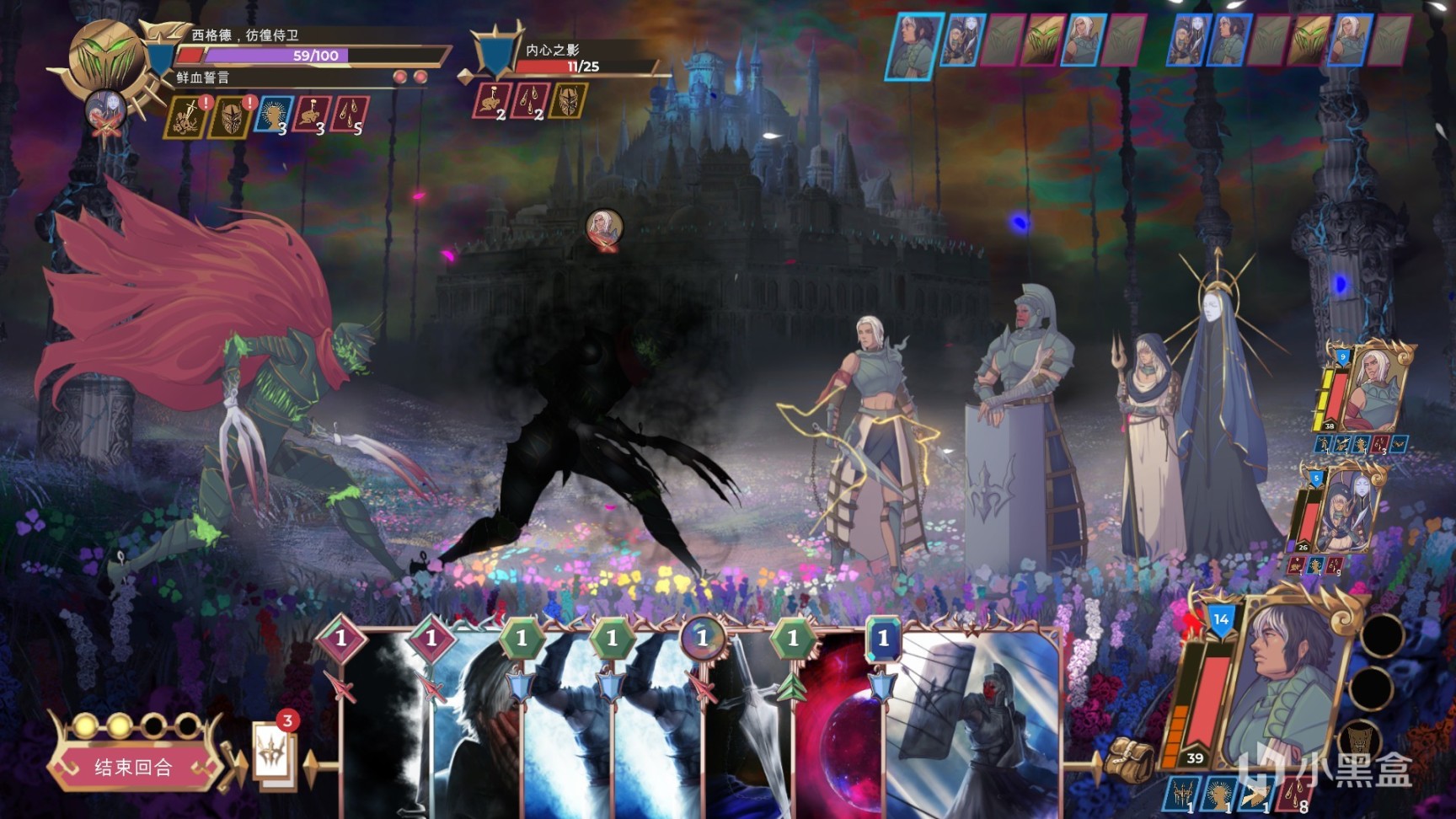 面對敵人,絲毫不懼,我方聖騎士、召喚法師、迅猛刺客會出手,玩家要根據他們的卡牌發揮對應的作用,個人而言,聖騎士重於防守卡牌,以一己之力庇護所有人,而刺客主要以卡牌疊加爆發流進行收割或是輸出,召喚師則以猥瑣疊渴望效果,發揮流血、羣傷等效果,合理搭配,戰鬥不累,因此每次得到的卡牌分配便需要拿好對應的卡牌。而遊戲以回合制進行,右上角顯示敵我雙方行動順序及此次戰鬥的獎勵任務,每回合獲得行動點有限,如何消耗點數打出卡牌行動便是一門學問,且外每個玩家的主動技能也十分關鍵,羣體祝福、單方增益等銜接其中,基本無秒殺套路,循序漸進爲上策。