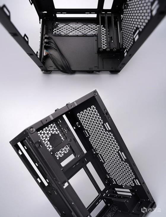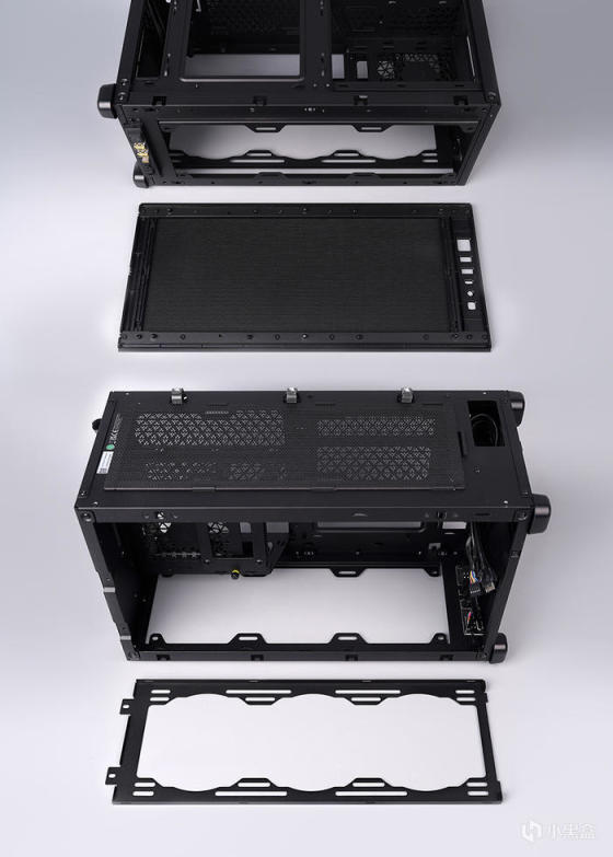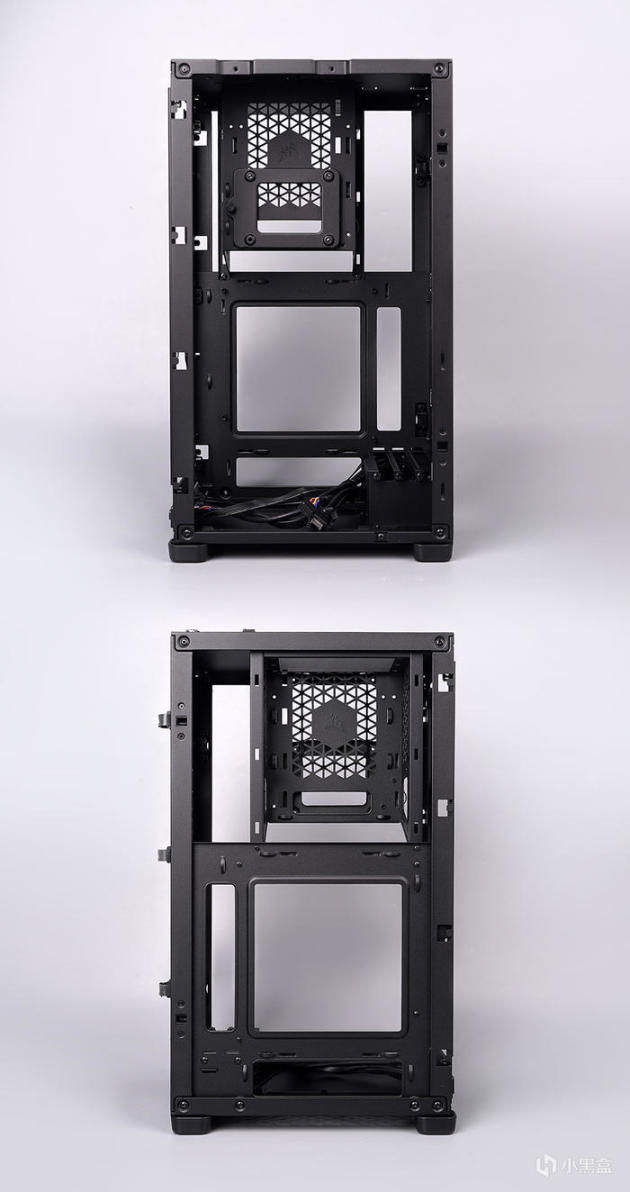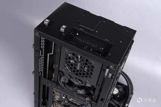 上置電源安裝位,帶有獨立電源倉設計,可支持 SFX/SFX-L 電源,電源外框給到有一個 2.5 寸 SSD 安裝支架,這邊上了塊假盤用來檔線,另還有兩個 2.5 寸安裝位位於機箱的頂部。