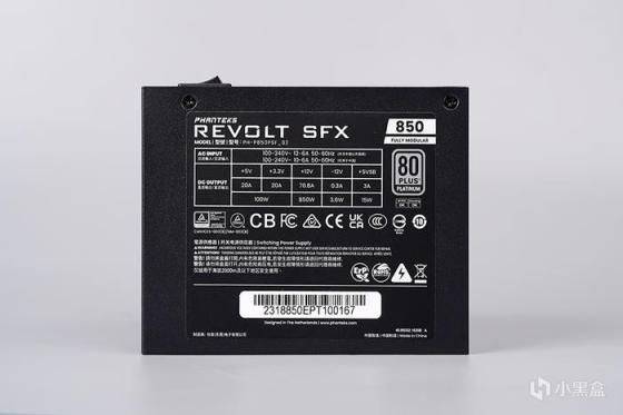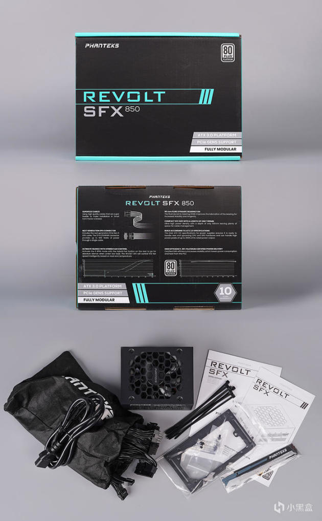 搭配電源,追風者 Revolt SFX 850W ,外包裝簡約風格設計,採用最新 ATX3.0 標準,支持 PCIe 5.0 12VHPWR 接口 ,具備 80PLUS 鉑金認證( 50% 系統負載時 92% 的轉化率 ),附件給到有標準規格的電源轉接板、魔術貼、固定螺絲、紮帶、電飯鍋線、說明書及質保卡。