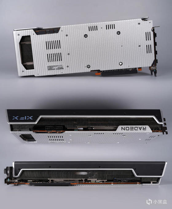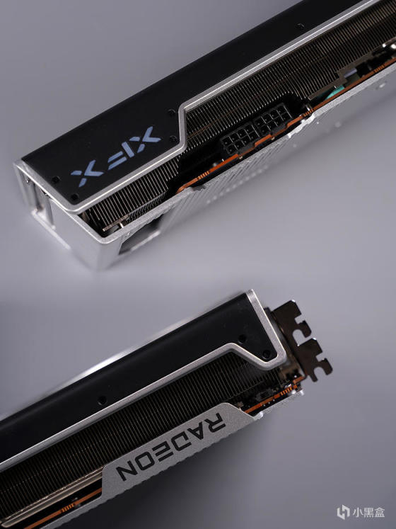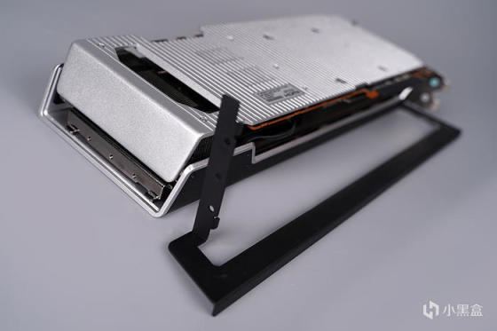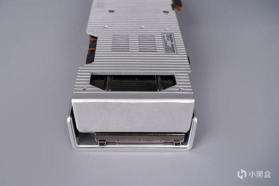 金屬背板通體銀色,表面極簡線條修飾,整體金屬感十足,也還給到這張顯卡硬朗的視覺效果,兩側外露大面積鰭片,增強進出風散熱,鰭片做工緊緻工整。