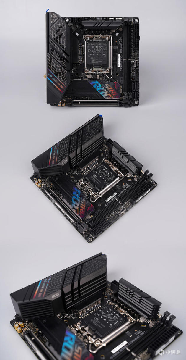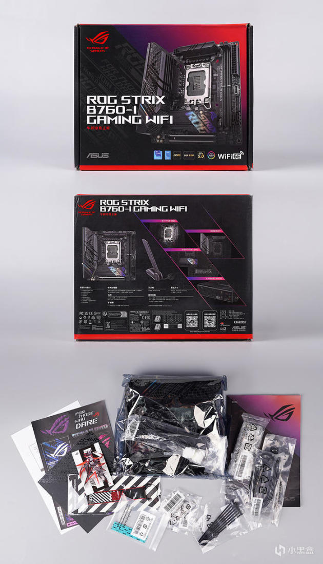 選用主板,華碩 ROG STRIX B760I GAMING WIFI,延續 ROG STRIX 系列的包裝設計,正面搭配主板本體展示,燙印的型號示意等,背面圖文展示主板的規格賣點等信息;翻箱後的全部附件,包含有WIFI 天線、入會卡片、信仰貼紙、ROG 鑰匙掛件、各種連接線、M.2 螺絲、說明書等。
