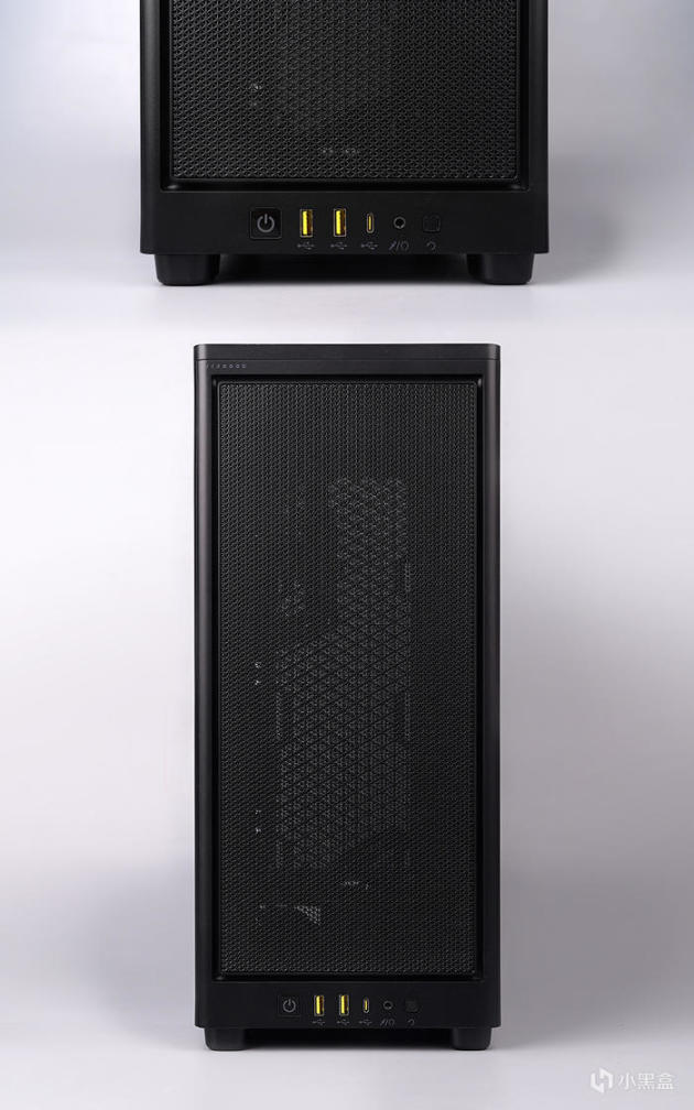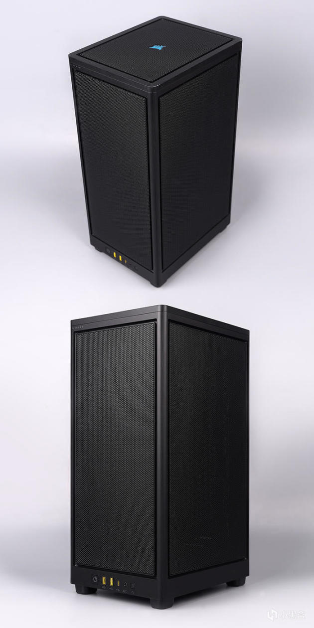 最後看看機箱,美商海盜船 2000D Airflow,MINI-ITX 規格的立式機箱,另有白色版本可選,且還有標配 3 把 ARGB 薄扇的高配版本可選。機箱尺寸爲:271 × 200 × 458mm,約爲 24.4L 左右。機箱外觀採用極簡的設計風格,呈方方正正的造型,前置、兩側及頂部採用 MESH 網孔面板樣式,兼具進風和防塵。
