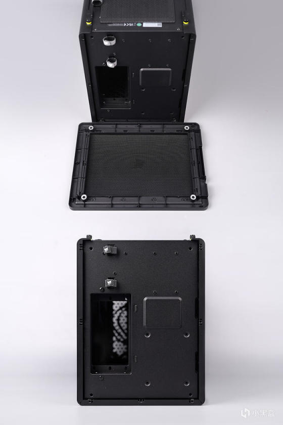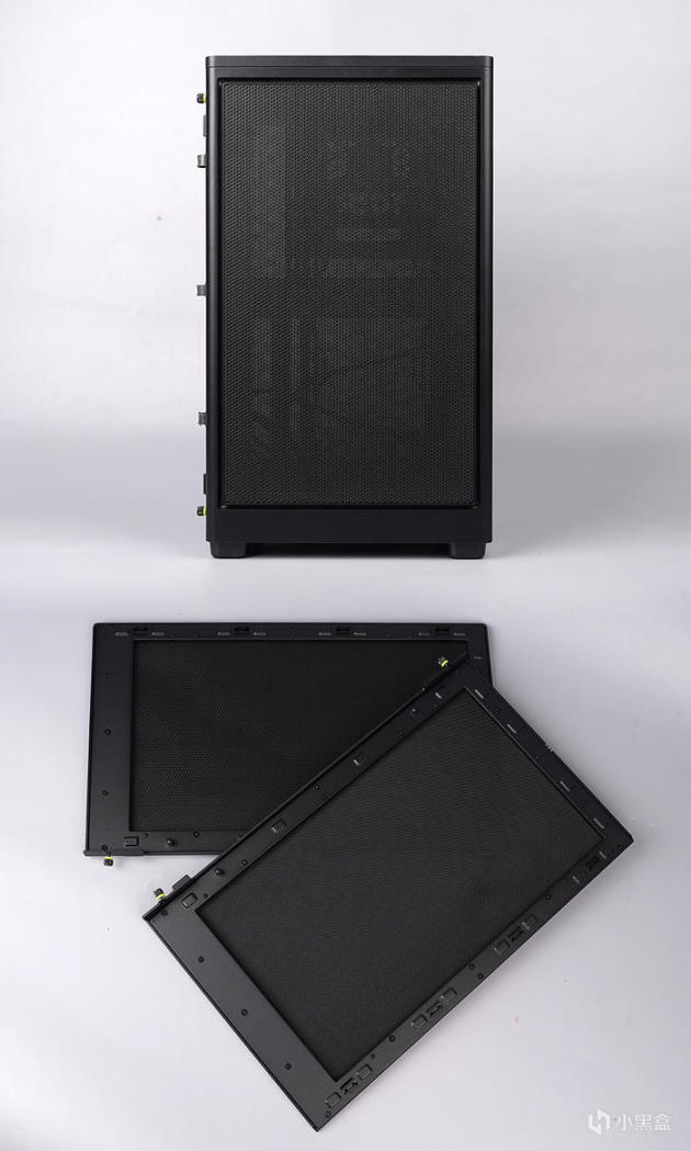 兩側的 MESH 網孔面板,採用卡扣式設計+手擰螺絲固定,免工具拆裝。面板內帶有金屬框加固,另網孔上覆蓋了一整面的防塵網,進一步提升防塵效果。