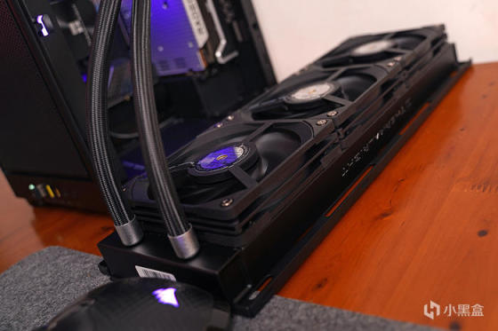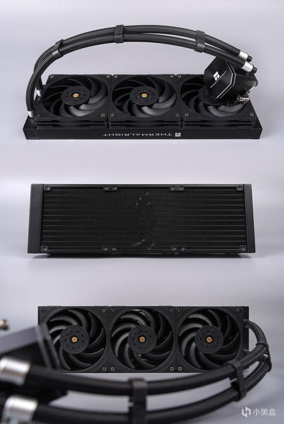 水冷本體採用通體黑色外觀設計,編織包網的橡膠水管,官標長度 45cm,另管子搭配有塑料卡扣,便於水管的塑性,給到更好的視覺效果。冷排具備有 14 條的水道,做工不錯,鰭片十分的整齊,官標厚度 27cm。搭配無光風扇 TL-B12,主打性能與靜音,採用動平衡點膠 2.0 工藝,有效減少摩擦和震動,降低運行時聲音和延長壽命,同時採用 STABLY-FDB 磁力穩定軸承,改善吊裝模式下扇葉抖震問題。