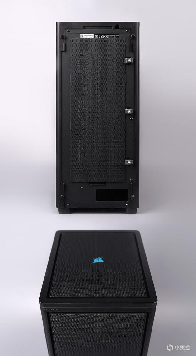 機箱尾部,散熱開孔覆蓋有磁吸防塵網,左右兩側板輔以手擰螺絲固定,左側給到有三個魔術貼,用於電源線的整理固定。前置左上角標註機箱型號 2000D,頂部賊船金屬標修飾。