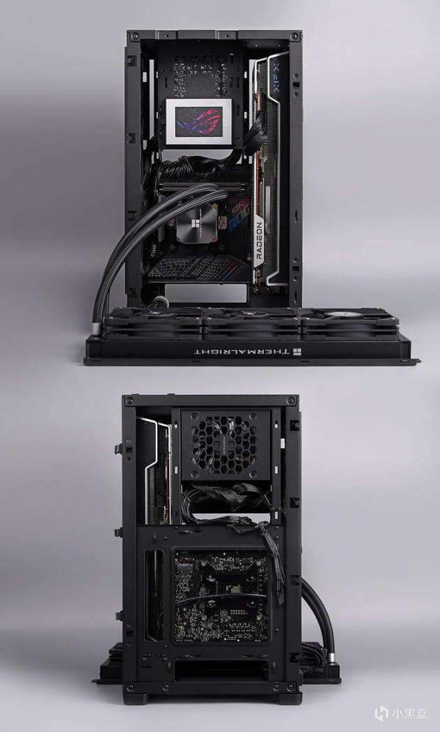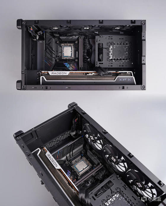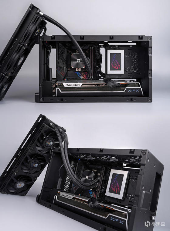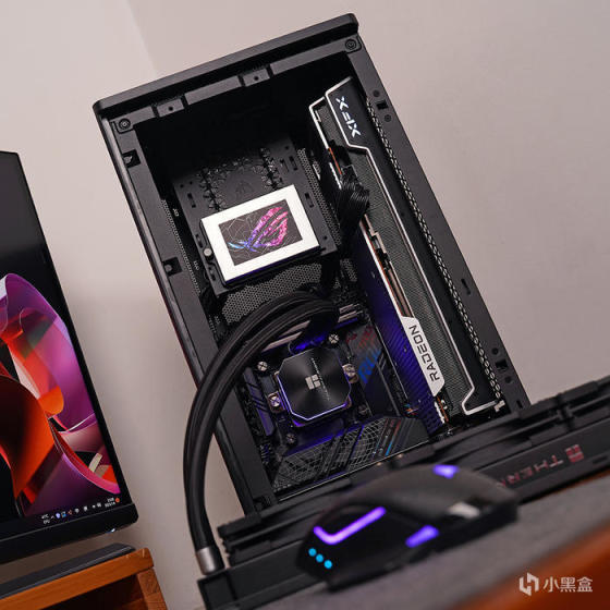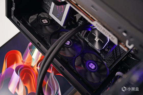 2000D 裝機並不繁瑣,比較麻煩的地方也就是機箱 I/O 線材的整理,這邊走主板上沿,同位置上的接口線材捆在一起,側冷排風扇通過一分三風扇連接線轉接,有利於支架拆裝,另外個人覺得更適合搭配標準 SFX 小電源,這樣電源倉可以給到足夠的空間藏線,簡化走線流程,也能有着更好的視覺效果。