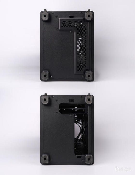 機箱底部,四個樸實無華的腳墊,提供穩定支撐。右側一個 L 型卡扣蓋板,表面賊船標誌性的三角形開孔,蓋板通過卡扣固定,輕鬆可拆卸。蓋板對應機箱內部的主板和顯卡 I/O 接口,可以起到一個隱藏和遮擋的作用。