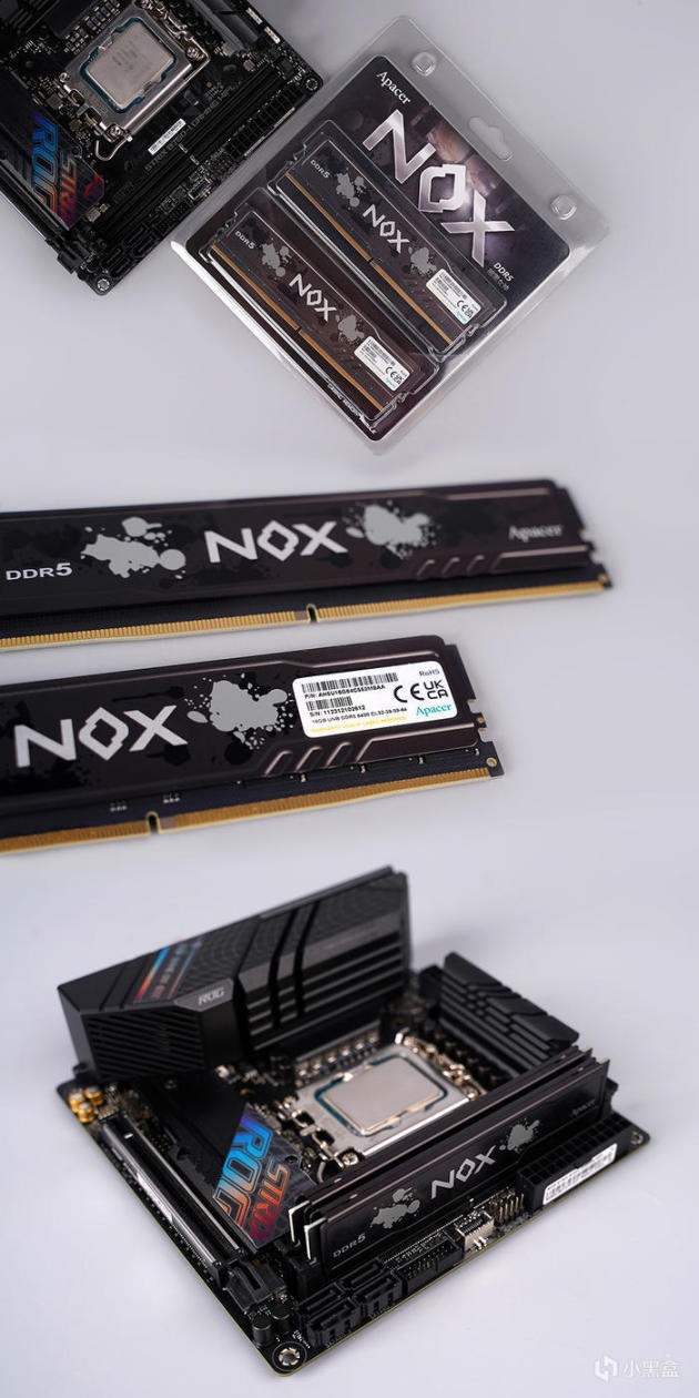 搭配內存,宇瞻 NOX 暗黑矮馬甲 DDR5 6400HZ 16G×2,,一款入門主打性價比 DDR5 內存,外觀採用低調無光的高兼容矮馬甲樣式,表面塗鴉圖案修飾,標註 DDR5 NOX A Apacer LOGO,一側規格貼標。
