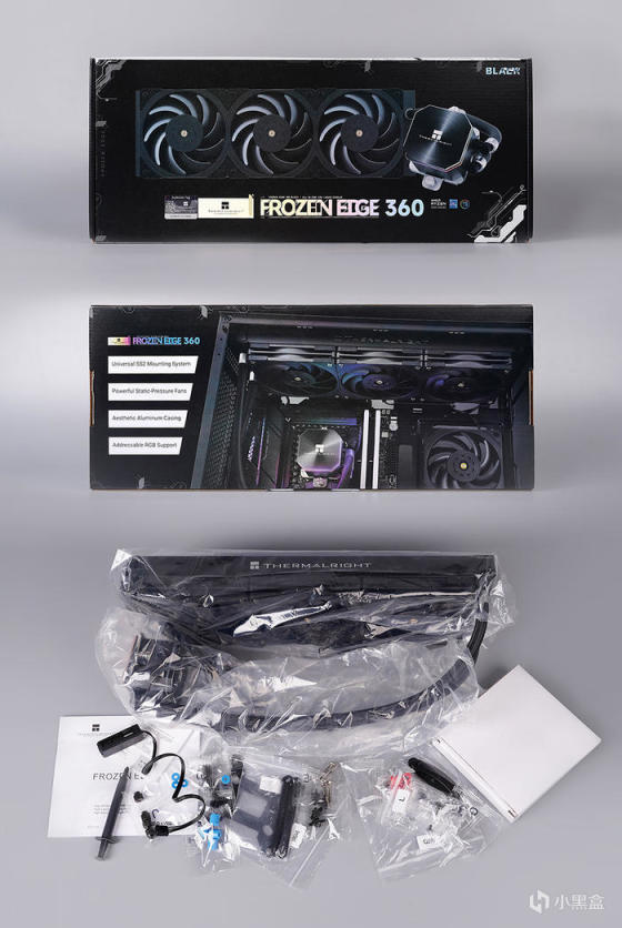 搭配一體式水冷,利民 Frozen Edge 360 BLACK 冰封幻刃,包裝正面產品渲染圖示意,下沿標註其型號,背面裝機效果圖,左側標註其賣點,扣具支持牙膏全家及 AM5 平臺安裝,附帶有風扇轉接線和散熱硅脂。