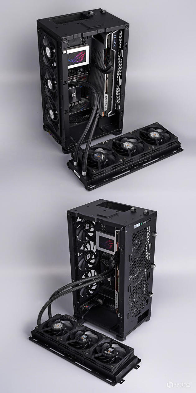 對應前置同樣也是風扇支架,這裏安裝了三個利民 TL-C12015B 薄扇(另外一個版本用的也是薄扇,實際標準扇也是可以的)用來排風,感覺這樣更合適一些,要是冷排一側排風的話,機箱放置在右側,熱風會直接吹到用戶臉上來。