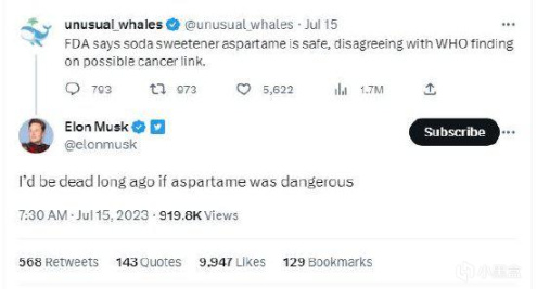 馬斯克對世衛組織的警告表示不屑一顧,他在FDA聲明下回復,“I'd be dead long ago if aspartame was dangerous”,如果阿斯巴甜致癌,那我早就死了!