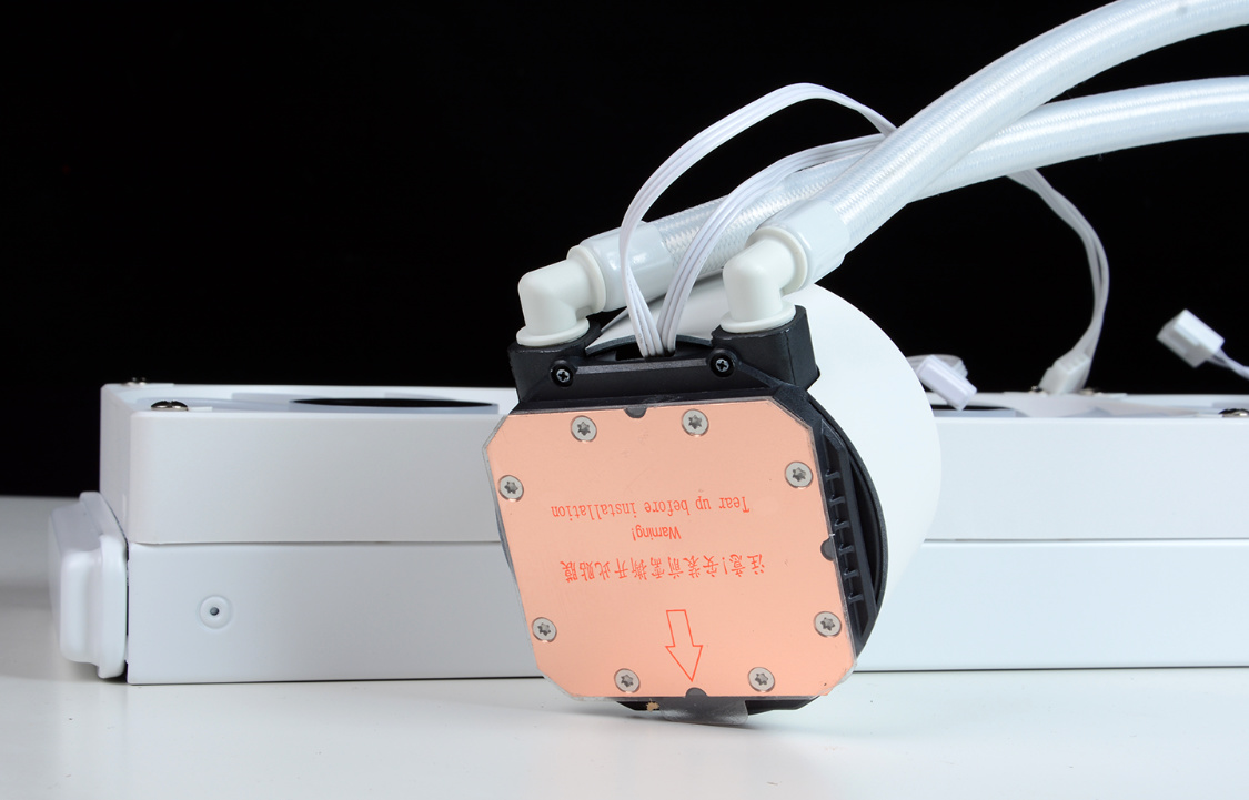 冷头顶部的顶盖采用支持阻尼式旋转的结构,纯白配色的顶盖搭配着隐藏在顶盖四周的ARGB灯带,颜值表现拉满。冷头内部的高扬程静音水泵最高可达2500RPM,最大扬程可达1.5M (Max),最大流量可达1300ml/min,满载运行时的噪音仅为30dB(A),在冷头底部大面积精雕微凸铜底的加持下,可以保证CPU能十分高效、稳定的运行;