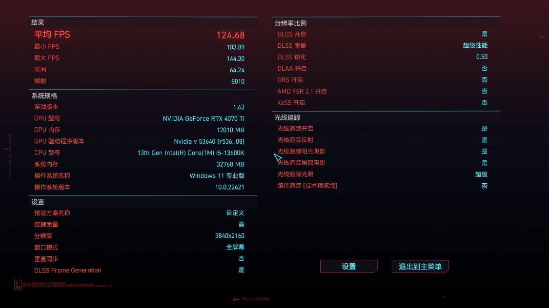 《赛博朋克2077》,画质超级,光追设为变态档位,4K分辨率下开启DLSS 3.0后,游戏实际帧率约为124.68FPS;2K分辨率下,游戏实际帧率约为213.18FPS。
