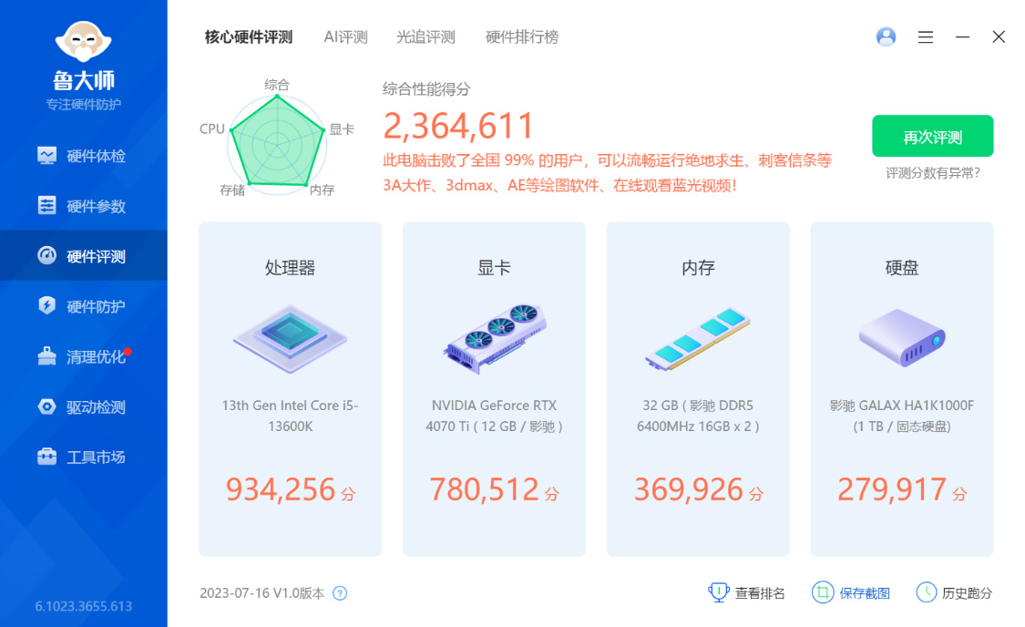 鲁大师整机测试得分236分,可以击败全国99%的用户;