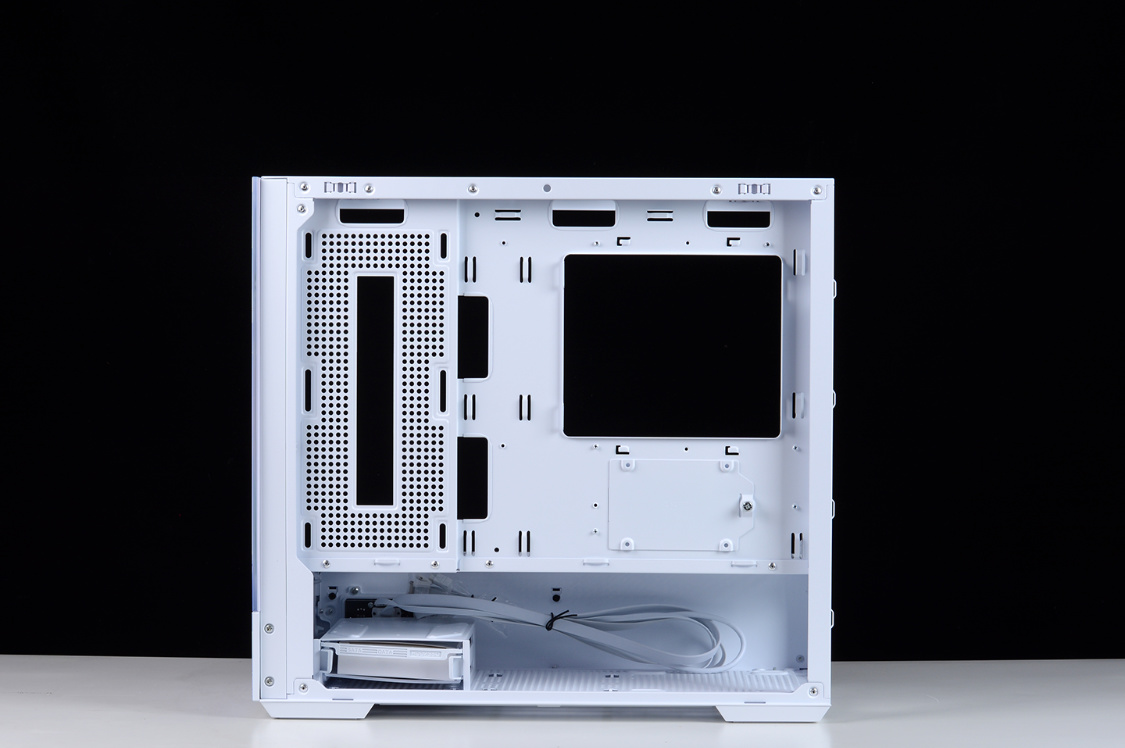 机箱预留了30mm深的背线空间,搭配8个理线开孔,对玩家理线非常友好。同时,还配置了2个3.5英寸机械硬盘位和2个2.5英寸sata硬盘位。
