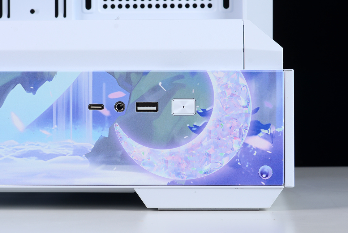 机箱I/O口位于左侧板右下方,除开关和二合一音频口子外,还配置了USB3.0*1和USB3.2 Typec*1。