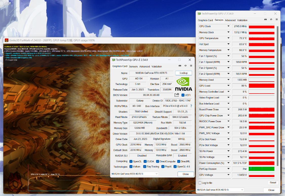再烤个显卡,功耗290W左右,显卡温度最高在73.3°。
