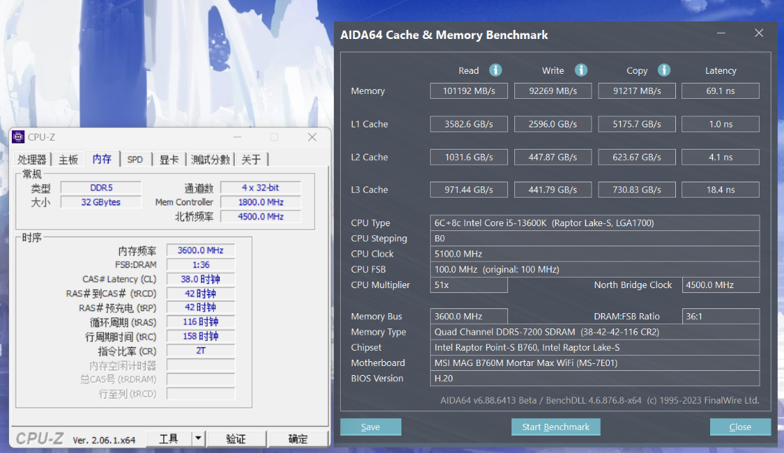 直接拉个7200MHz,内存读写测试,读取速度为101192MB/s,写入速度为92269 MB/s,复制速度为91217MB/s,延时为69.1ns;