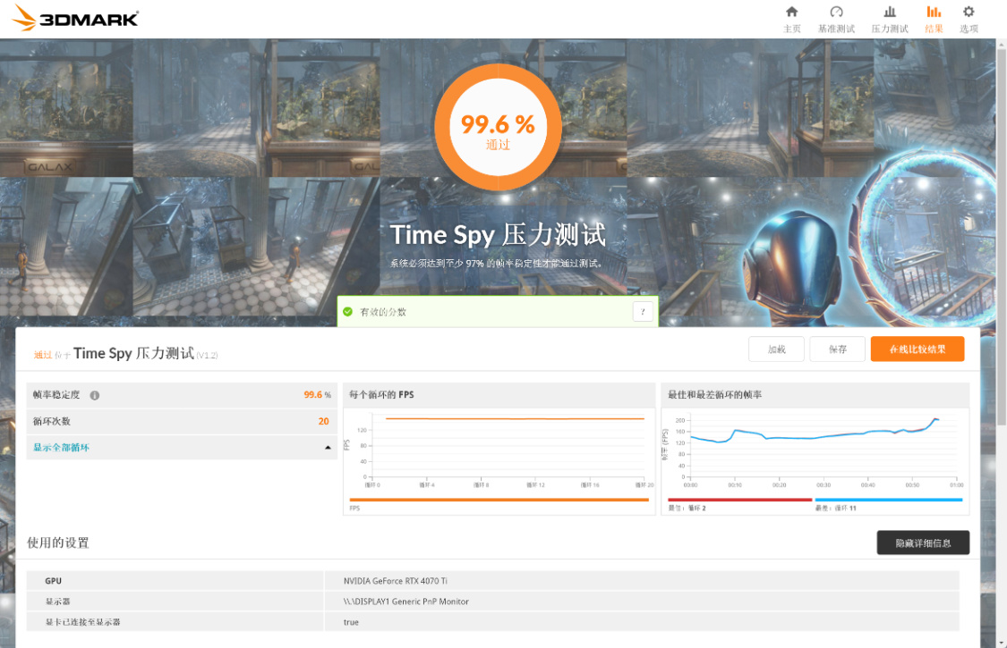 换过壳的显卡,3D Mark跑个压力测试,通过率99.6%;