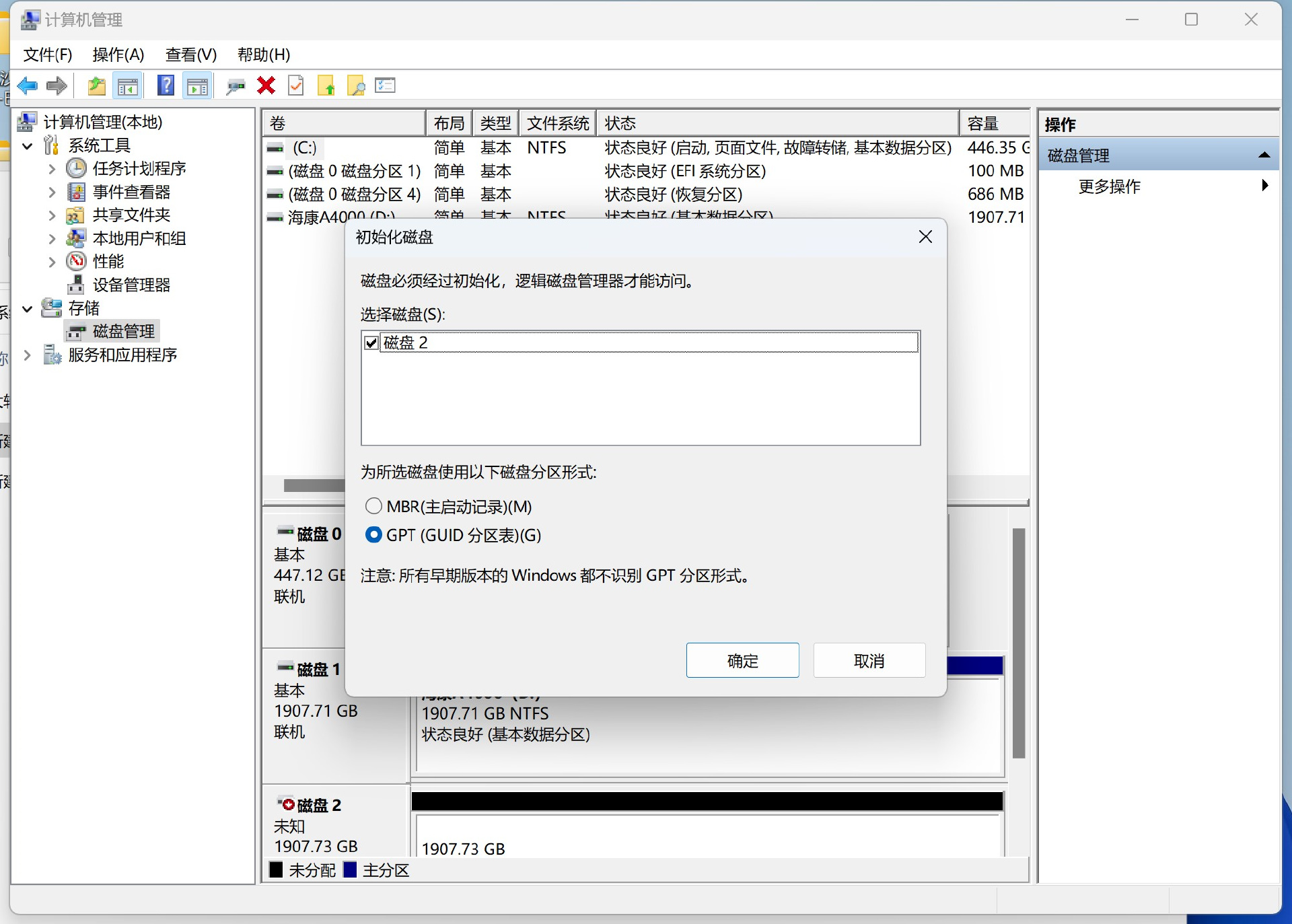 再然后点击左侧下方的“磁盘管理”,就会发现跳出来一个提示你是否初始化的对话框,点击确定即可。