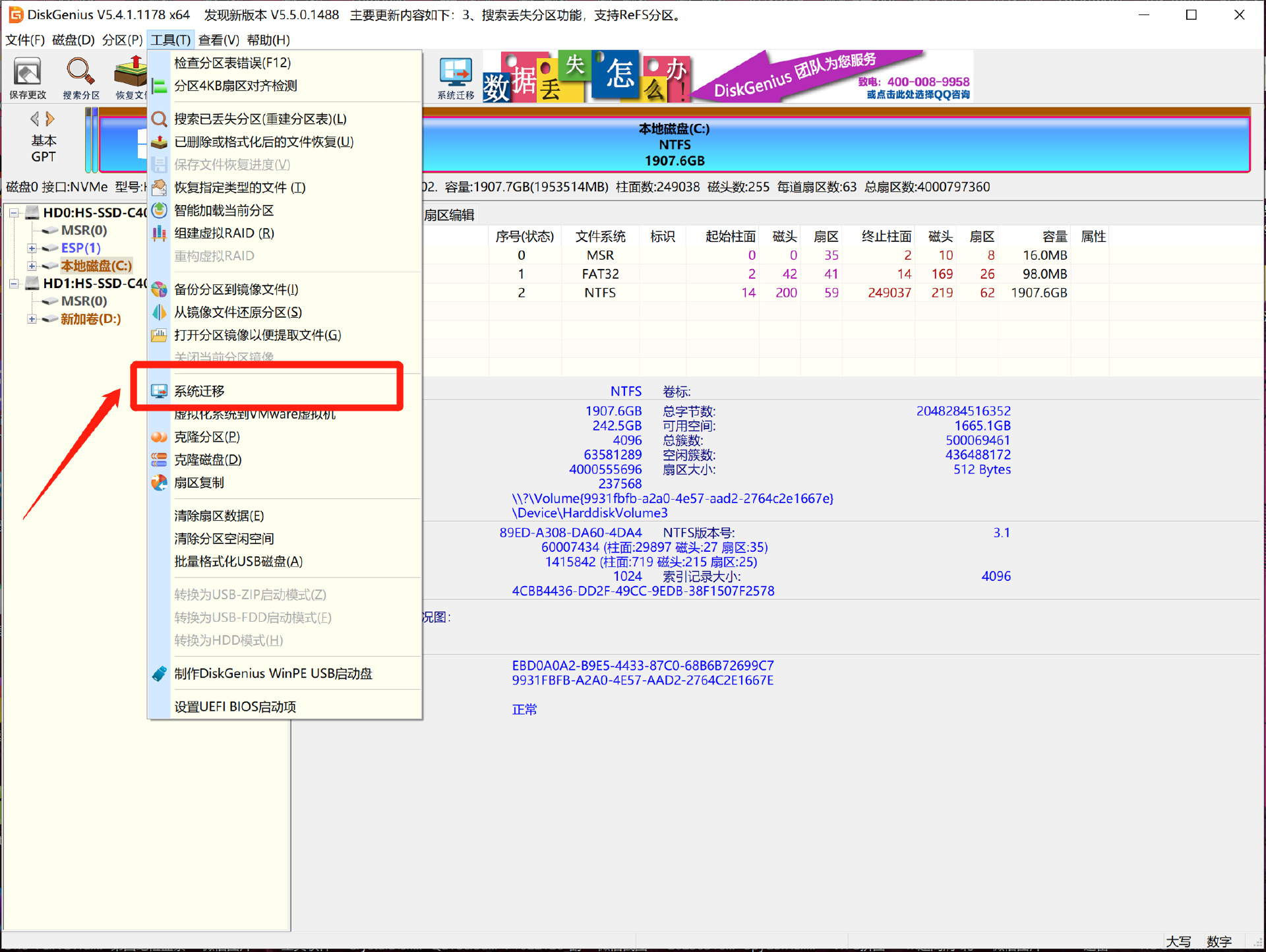 首先打开DiskGenius,在工具,选择“系统迁移”功能。