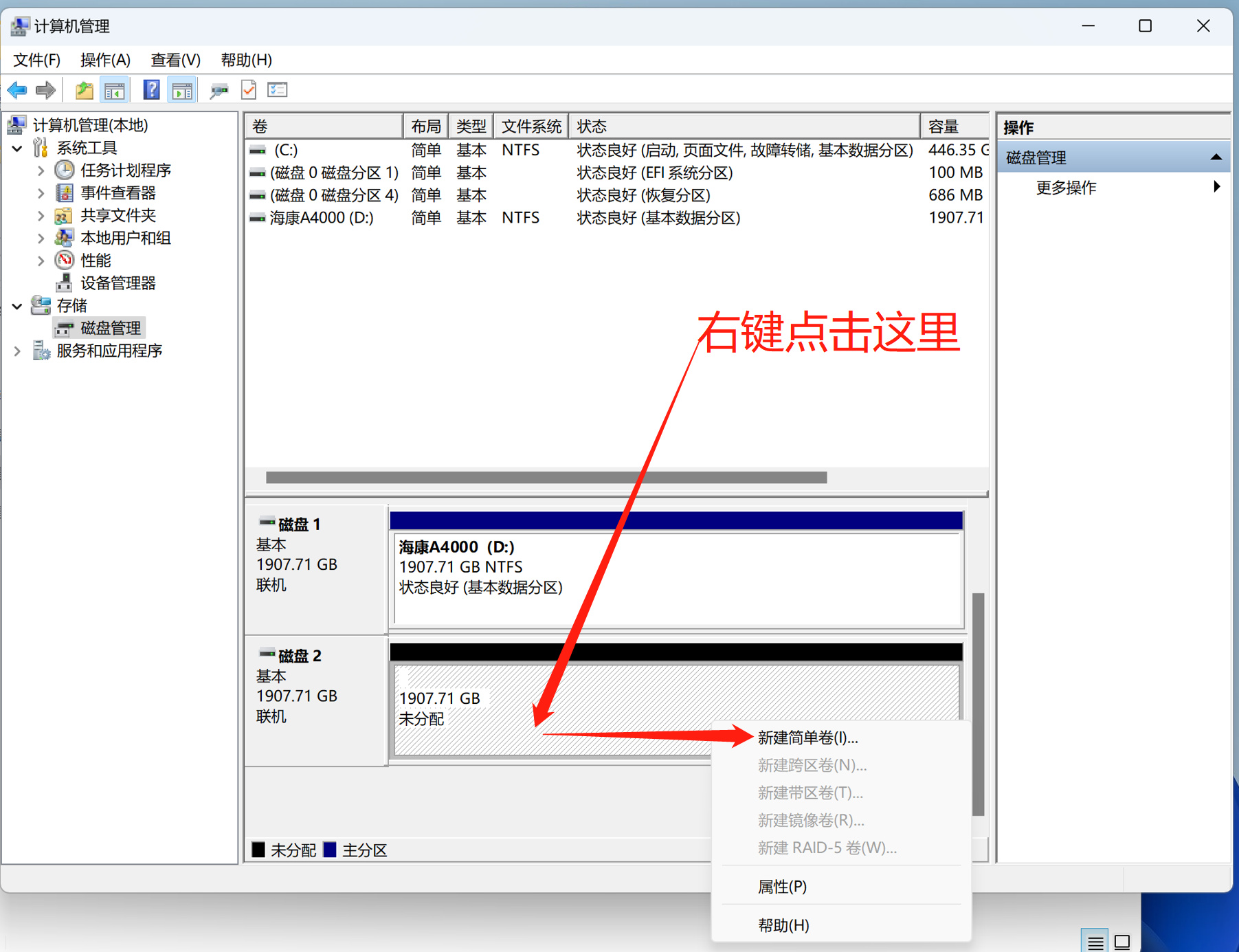 然后在页面下方可以看到一个未格式化的硬盘,这就是我们新添加的SSD了。此时我们右键单击这块区域,然后选择“新建简单卷”,给它分配一个新分区。