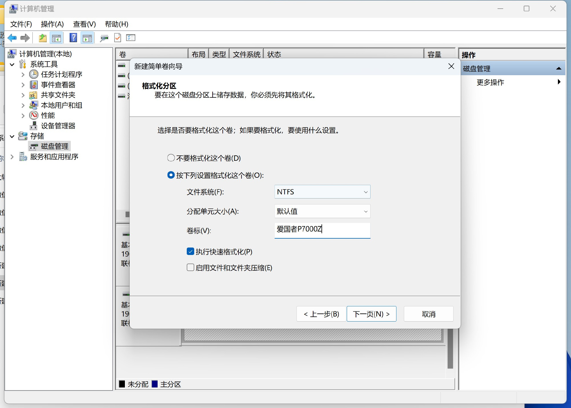 在下图这个窗口时可以停一下,这里可以手动分配盘符和给分区加上卷标,就相当于给这个分区做个备注了,看起来可以一目了然。