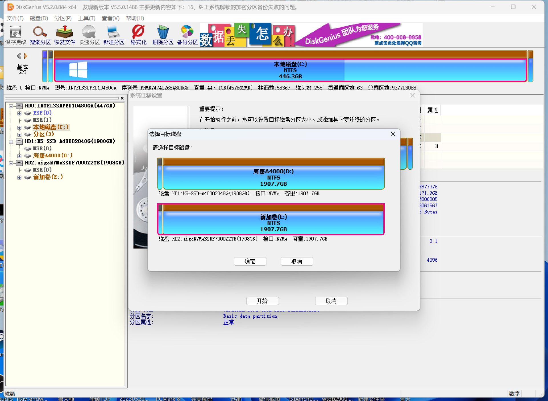 然后选择我们需要将系统迁移到的新硬盘。这里C盘所在的硬盘是旧硬盘,我们选择自己想要存放系统的新硬盘,再然后点击确定,即可开始。