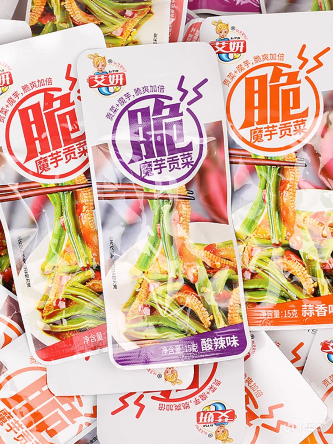 不知道是它的問題還是我沒喫過貢菜的緣故,這裏邊的貢菜稍微有點硬,雖然也是脆脆的但是不太好嚼。魔芋對標衛龍的話就是沒有那麼韌,會更脆一點;有酸辣、香辣和蒜香三個口味。整體都還挺重口的,每包裏都會有辣椒碎,又鹹又辣讓我一口想起配粥的小鹹菜,甚至蒜香都是有點辣的。而且比較驚訝香辣竟然比酸辣還要辣一個度...甚至難得的是我覺得酸辣比香辣好喫的小零食。