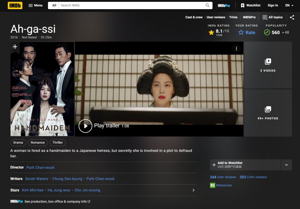 一部2016年上映的韓國電影,改編自英國作家莎拉·沃特斯的小說《荊棘之城》,英國bbc也改編過該小說拍過迷你劇《指匠情挑》。本片由金敏喜、金泰梨主演,影片講述了一個貴族小姐、小姐的僕人、騙子伯爵之間關於金錢的欺騙和愛情的故事。影片從臺詞、表演和畫面來看,都突出一個“污”字,這樣的一個污與關於金錢的欺騙比較符合,與貴族小姐的氣質和貴族小姐與女僕之間的愛情形成了強烈的反差。主角們的演技出色,騙子的無恥,女僕的愚蠢以及小姐的聰明都表現得非常到位,劇中幾次反轉都非常合理,完美展現了一個騙中騙的愛情故事。(PS:觀看時還是得戴上耳機獨自觀看,我已經提醒你了奧)
