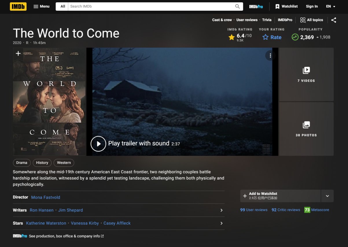 一部2021年上映的美國電影,由凡妮莎·柯比、凱瑟琳·沃特森主演的愛情片,本片講述了在19世紀的美國邊疆,兩位已婚女性逐漸超越友誼到愛情的故事。凡妮莎·柯比,《碟中諜6》中的白寡婦,美的不可方物,居然演過同性片子,火速觀看。影片聚焦於兩個已婚家庭婦女之間的友誼,從相識到互相欣賞,再到思念彼此最後相愛,影片的節奏緩慢,雖然故事到現在看來略微有點俗套,但導演將畫面展現的很唯美,很懂得充分利用兩位主演的顏值與演技,來講述這一讓人心痛的意難平的故事。