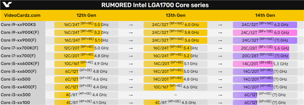 根據之前曝料,14代i7系列全部8+8核心變成8+12核心,i5系列有8+8、6+8核心兩種組合,i3系列則是全部6個大核心。