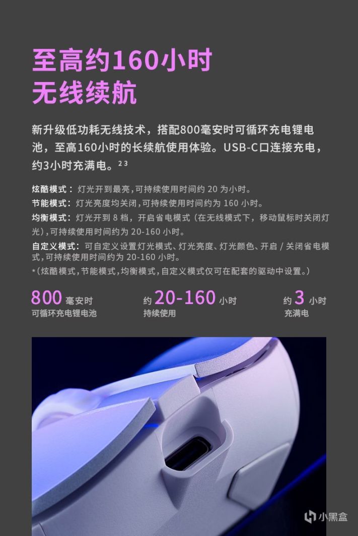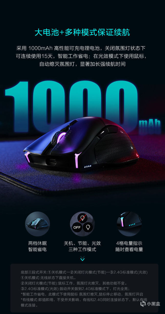 “雷柏智能算法V+”是一项优秀的无线技术。”雷柏V300W“具备1毫秒的快速响应速度和超过10米的传输距离,可以提供稳定和可靠的游戏连接。此外,它还配备了三种抗干扰技术和Nordic低功耗芯片,以确保信号稳定和低延迟的游戏体验。内置800毫安时锂电池,使其长达20-160小时的续航时间,让您可以更加持久地享受游戏乐趣。同时,三区域约1680万色RGB背光和V型纹理防滑侧裙增加了鼠标的外观设计和使用舒适性。