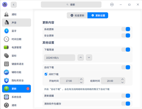 在控制中心-更新-更新設置模塊,可以自行設置自動下載更新的時間段、下載速度。