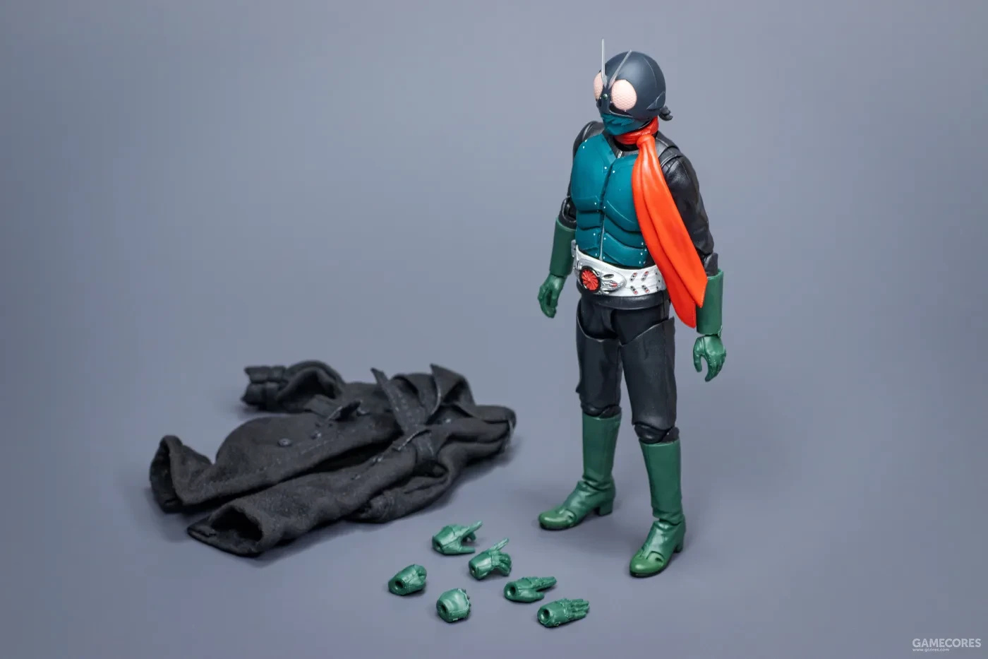 - 圍巾瑕疵,本品另一點不足是膠質材料的圍巾。商品只配屬了下垂造型,沒有給飄揚造型替換件,不過這點還屬於接受範圍之內。圍巾的可動方面,頸部圍巾造型膠圈限制住了脖子可動,導致角色無法低頭。有能力的玩家自行去除膠圈換上布制圍巾,才能解放脖子可動。