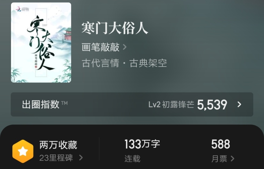 代表作:《寒门大俗人》、《寒门嫡女有空间》