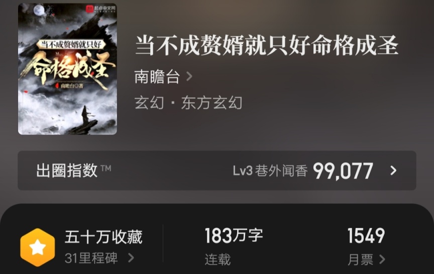 代表作:《当不成赘婿就只好命格成圣》、《我有一棵神话树》