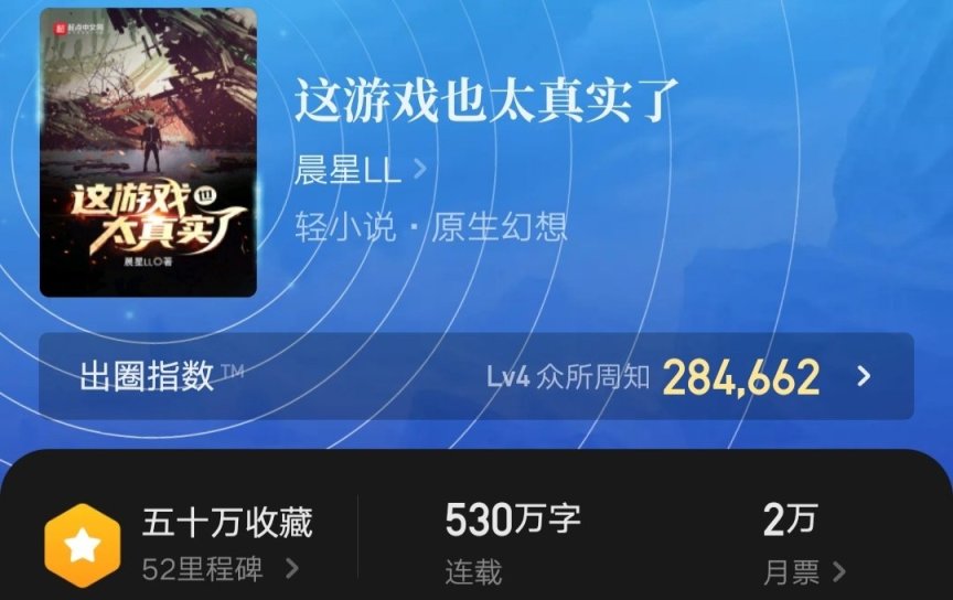 比如我最喜欢的作者晨星LL,一本《我在末世有套房》(可惜被404了),一本《学霸的黑科技系统》,都是我很喜欢的小说,剧情高潮点刷了好几遍。《这游戏也太真实了》的亮眼成绩也使得晨星拿一个白金既是水到渠成,又是板上钉钉。