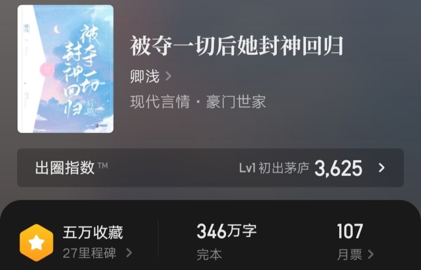 代表作:《被夺一切后她封神回归》、《真千金她是全能大佬》、《灵妃倾天之妖帝已就擒》、《绝世驭灵师》